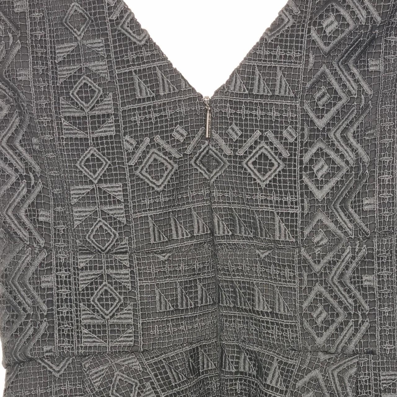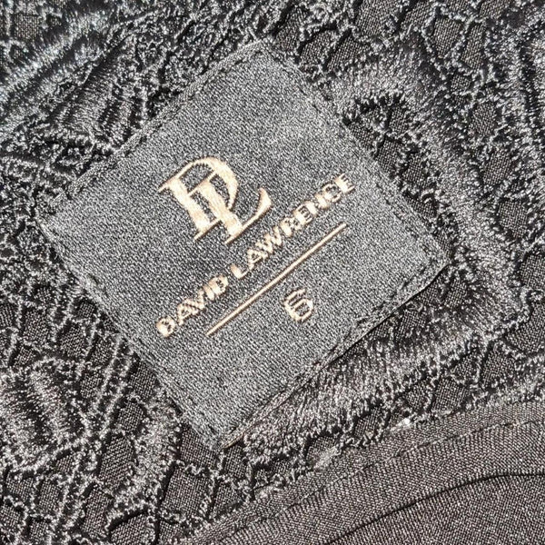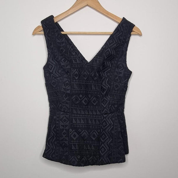 David Lawrence Black Jacquard Sleeveless Top Size 6 Classic and sophisticated David Lawrence jacquard top in black with a textured geometric pattern. A versatile piece perfect for workwear, dinner, or events. - Brand: David Lawrence - Size: 6 AU - Colour: Black with textured jacquard weave - Sleeveless with V-neckline front & back - Tailored, structured fit - Subtle peplum-style hem for a flattering silhouette - Closure: Exposed zip at the back with.