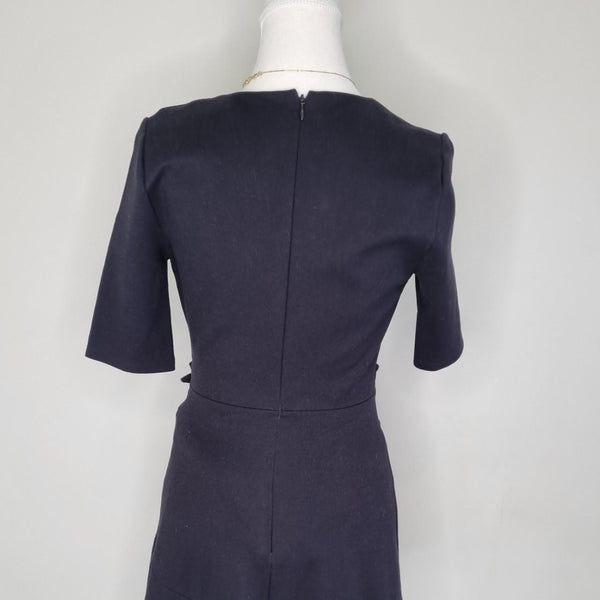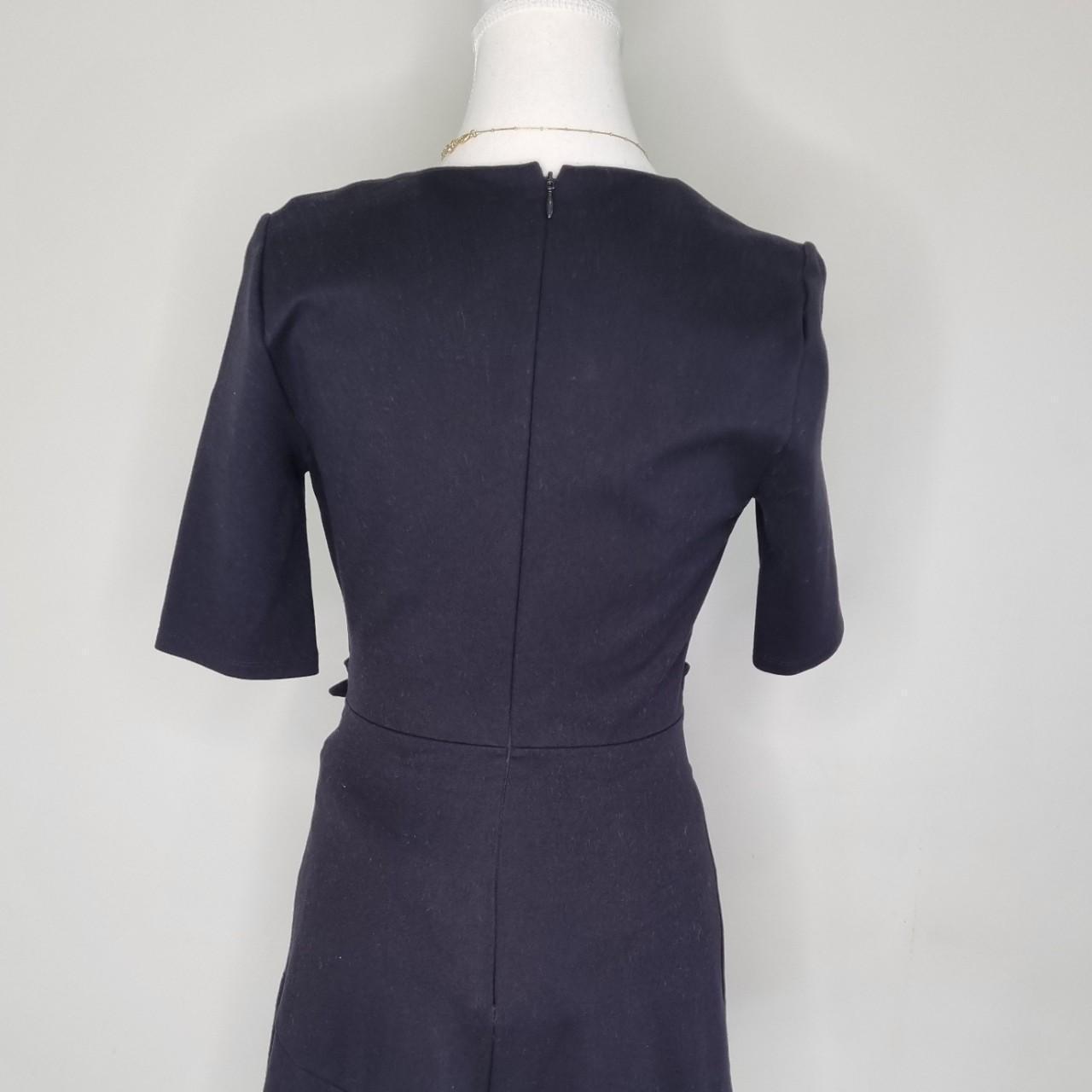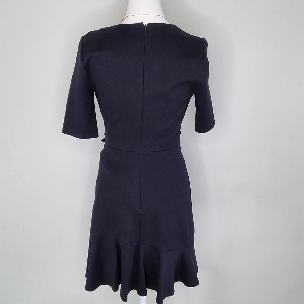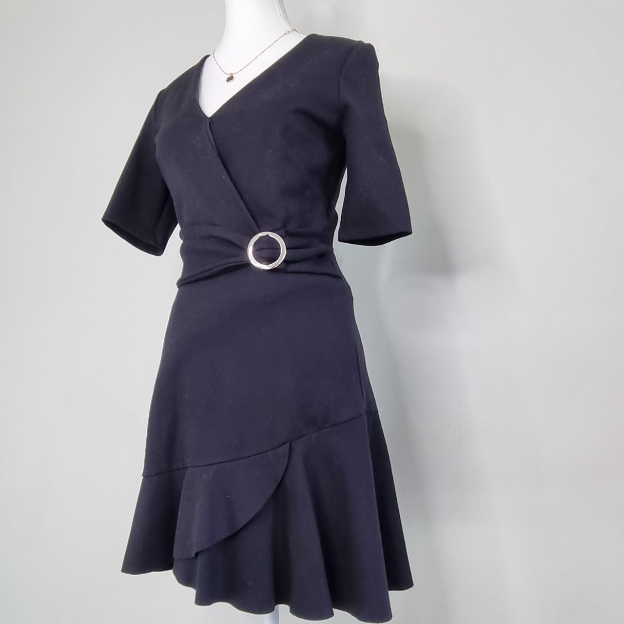 Classic and elegant black dress from Portmans, perfect for work, events, or dinner dates. Features a flattering wrap-style V-neckline, short sleeves, and a silver ring belt detail at the waist for shape. The skirt has a soft layered ruffle hemline, giving it a feminine and timeless silhouette. A versatile piece you can dress up with heels or wear casually with flats.