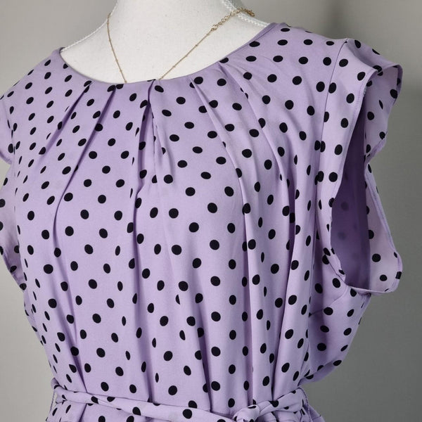 Chic and feminine Portmans dress in a lilac base with classic black polka dots. Includes wrap tie around waist.