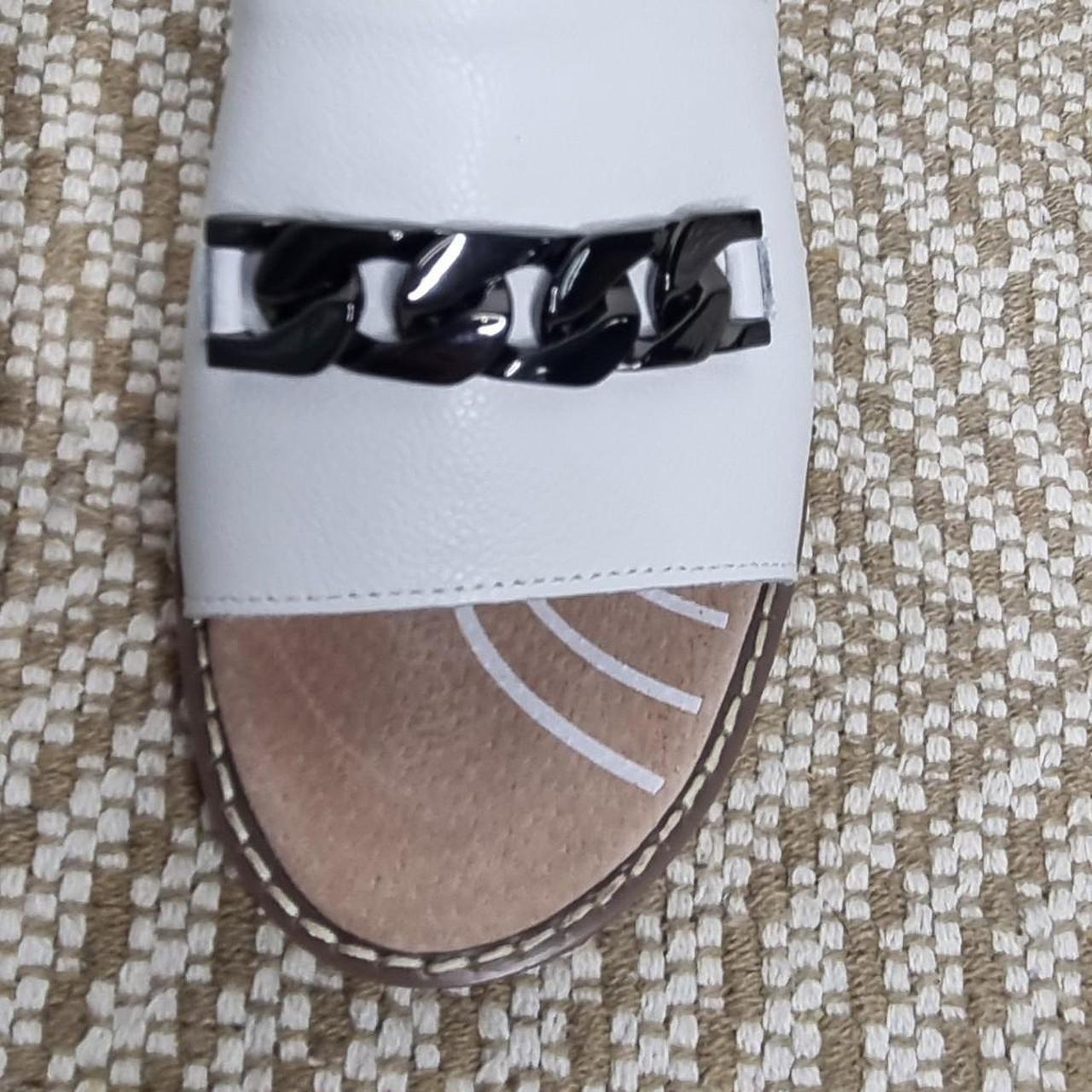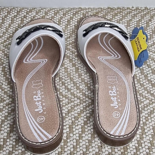Just Bee Comfort White Leather Sandals with Black Chain Detail – Size 40 (AU 9) – Brand New