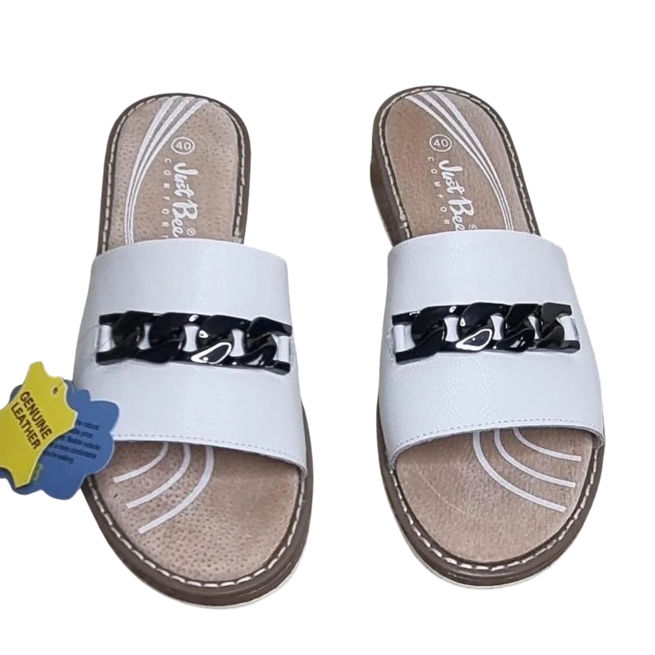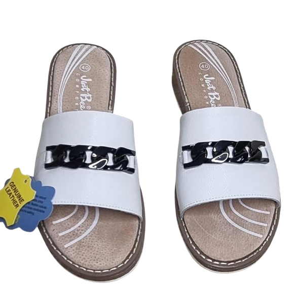 Step into comfort and style with these brand new Just Bee Comfort sandals, crafted from genuine leather for a premium feel and durability. The fresh white upper is accented with a bold black chain detail across the strap, making them a versatile statement piece.
