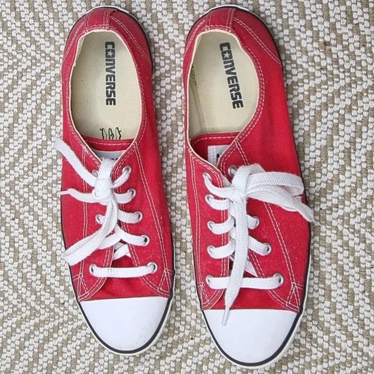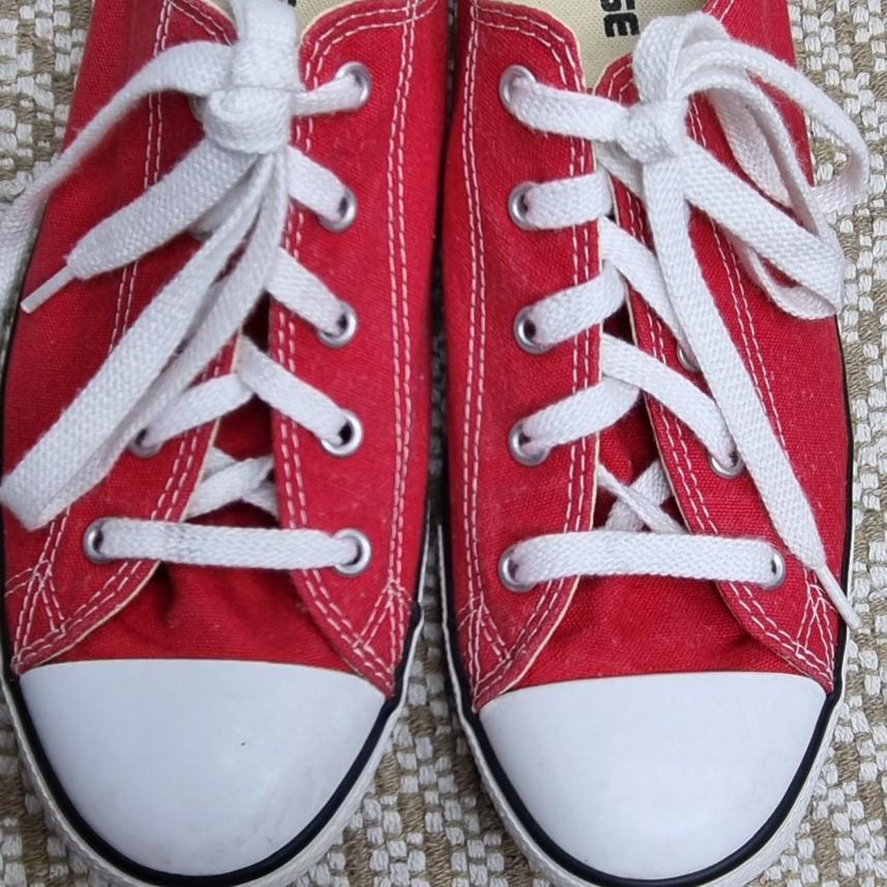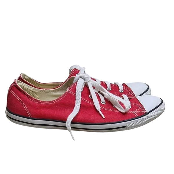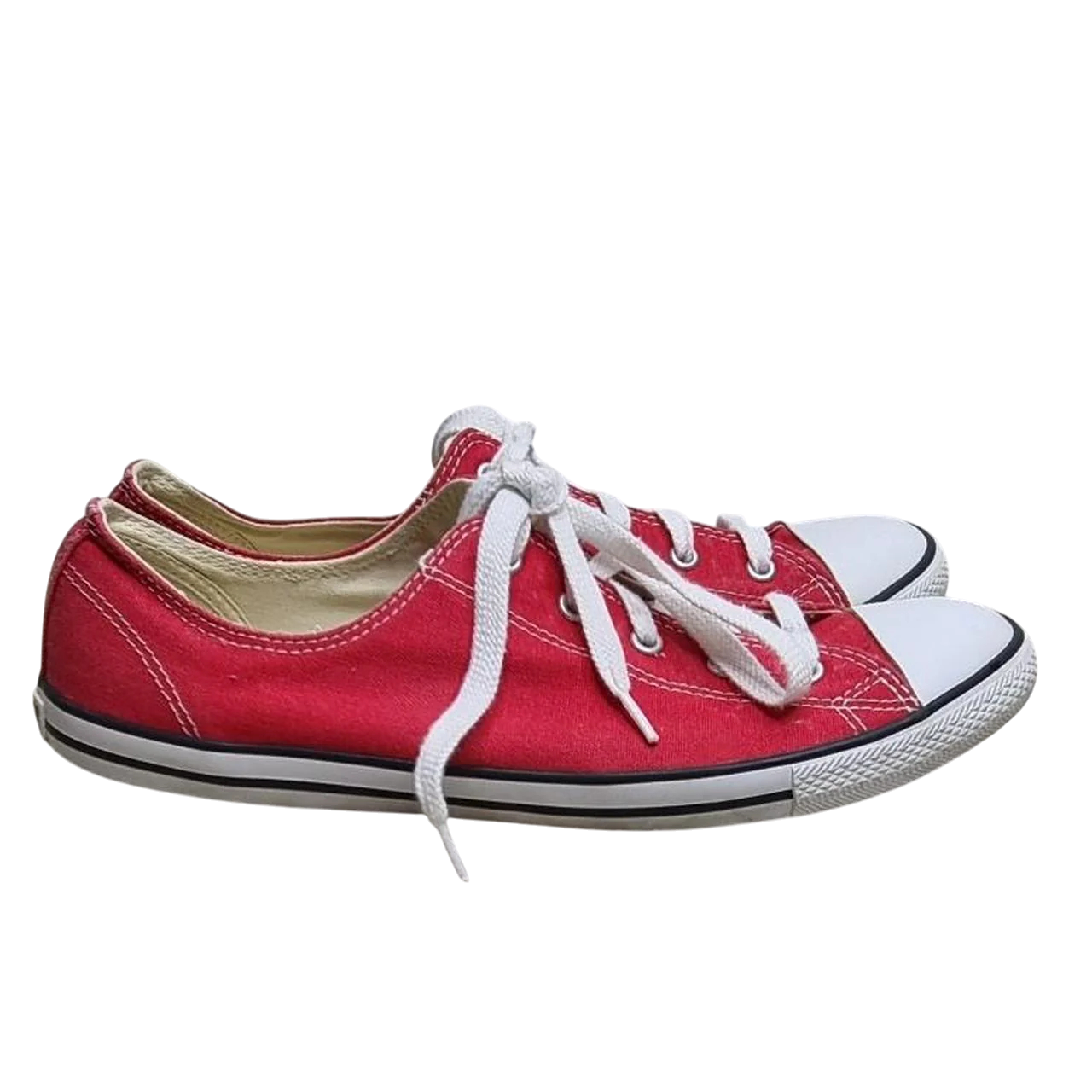 Converse Chuck Taylor All Star Low Top Sneakers – Red – Women's AU 11 / US 11 / UK 8.5 / EU 43.  Classic Converse low-top sneakers in vibrant red canvas with white laces and rubber toe caps. Timeless streetwear style that never goes out of fashion. A wardrobe staple – pairs with everything from jeans to dresses.