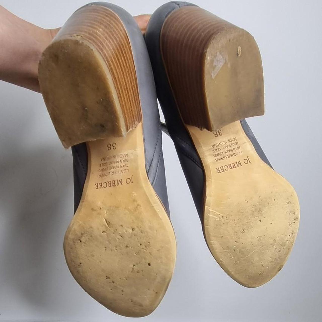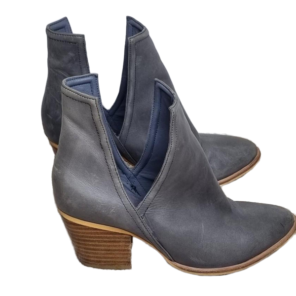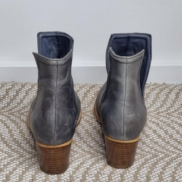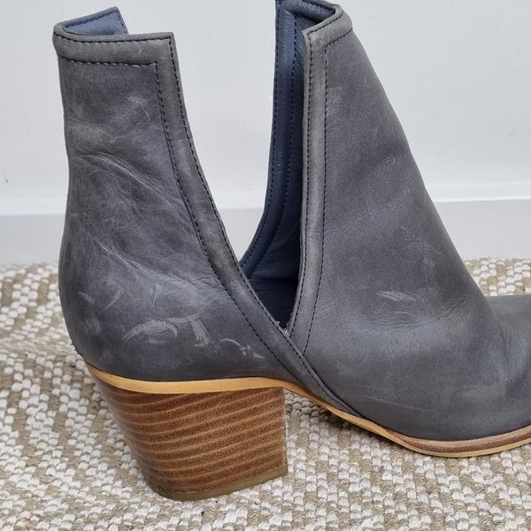 Jo Mercer Grey Leather Ankle Boots – Size 38 (AU 7 / UK 5 / US 7.5). Stylish and versatile grey leather ankle boots from Australian brand Jo Mercer. Designed with a stacked wooden block heel and modern deep V-cut sides for an elongated look. Leather upper with manmade lining and sole for durability. Quality boots that combine comfort, style, and durability.