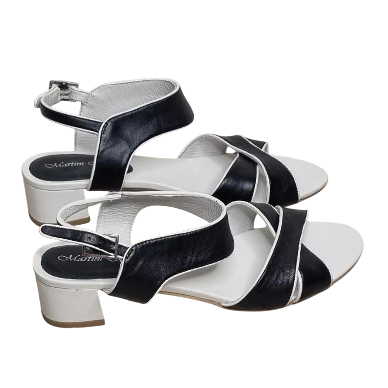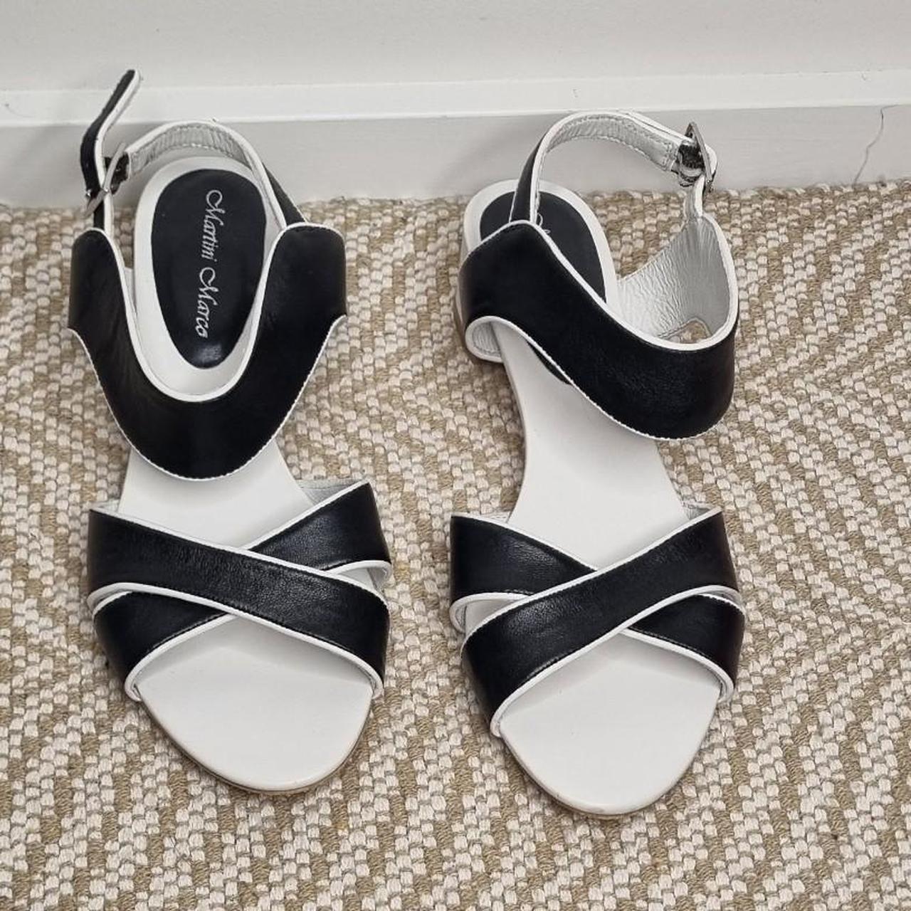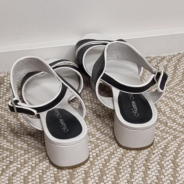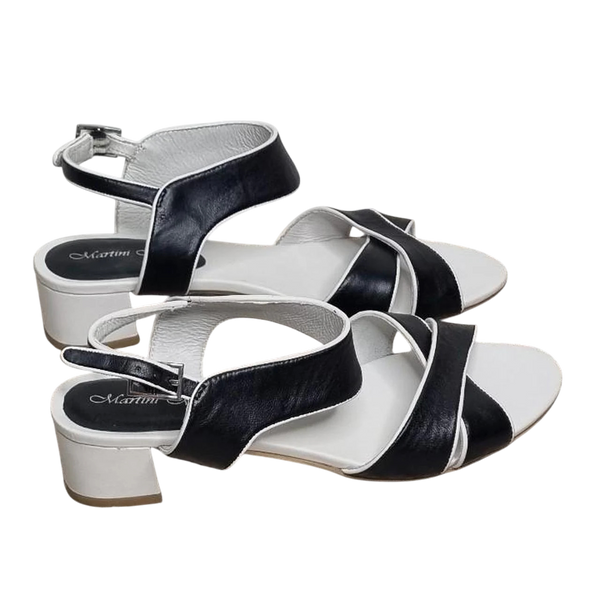 Chic and modern, these Martini Marco sandals feature a bold black and white leather design with criss-cross front straps and a supportive ankle buckle strap. A versatile style that works for both casual and dressy looks. Standout monochrome design – a comfortable yet statement sandal that’s not easy to come by.