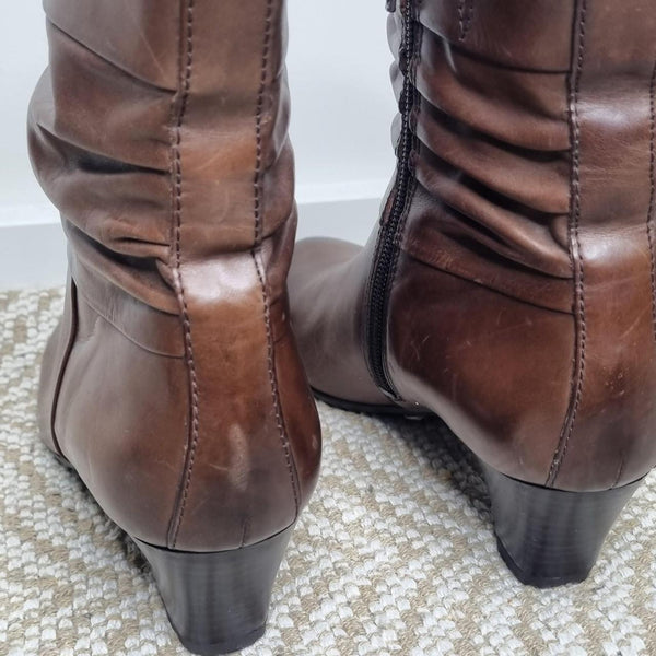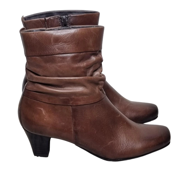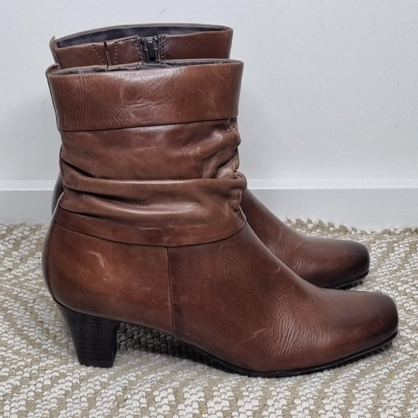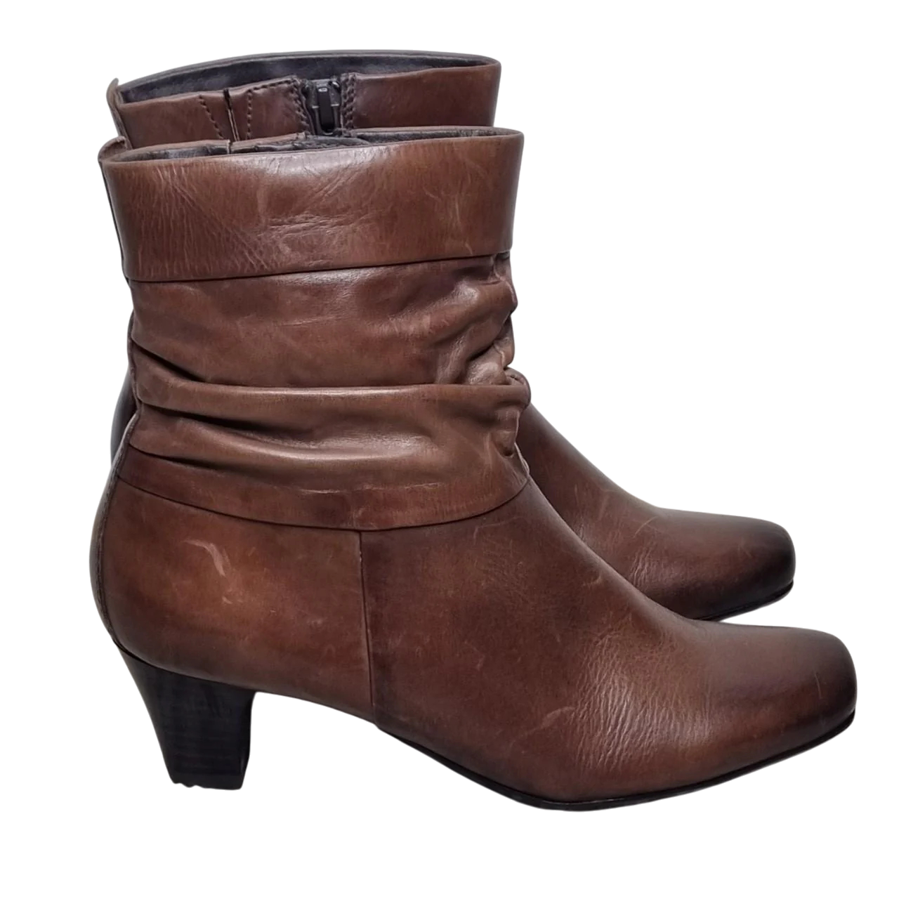 On-trend Sandler ankle boots in rich brown leather, featuring a stylish square toe, soft ruching detail at the ankle, inside zip closure, and a comfortable mid-height block heel. A versatile wardrobe staple — perfect for pairing with jeans, dresses, or workwear.