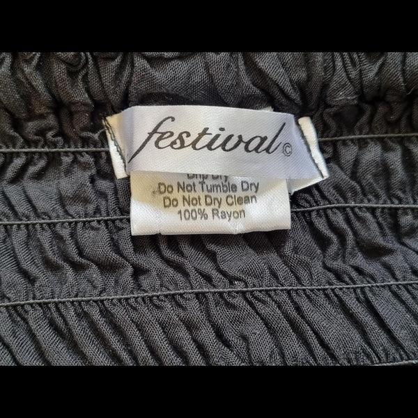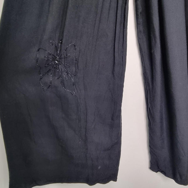 Boho-inspired black rayon pants by Festival, featuring a comfortable shirred elastic waistband and a relaxed wide-leg silhouette. Detailed with a delicate black beaded butterfly motif at the leg, adding a subtle statement touch. Lightweight and flowy, perfect for summer, beachwear, or festival styling.