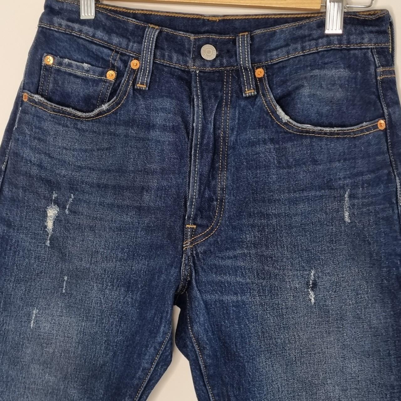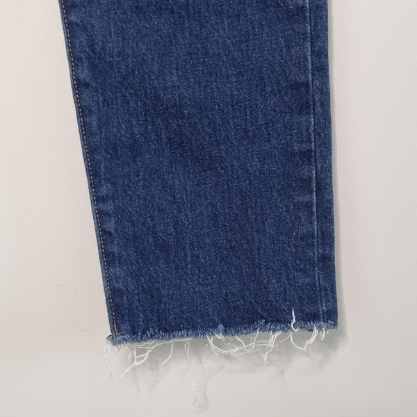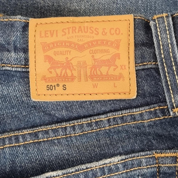 Iconic Levi’s 501 Skinny in a dark vintage wash with subtle distressing and raw frayed hems. Designed with the classic button-fly closure, 5-pocket style, and a hint of stretch for comfort.