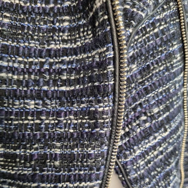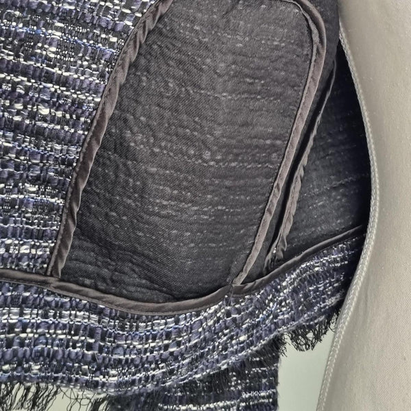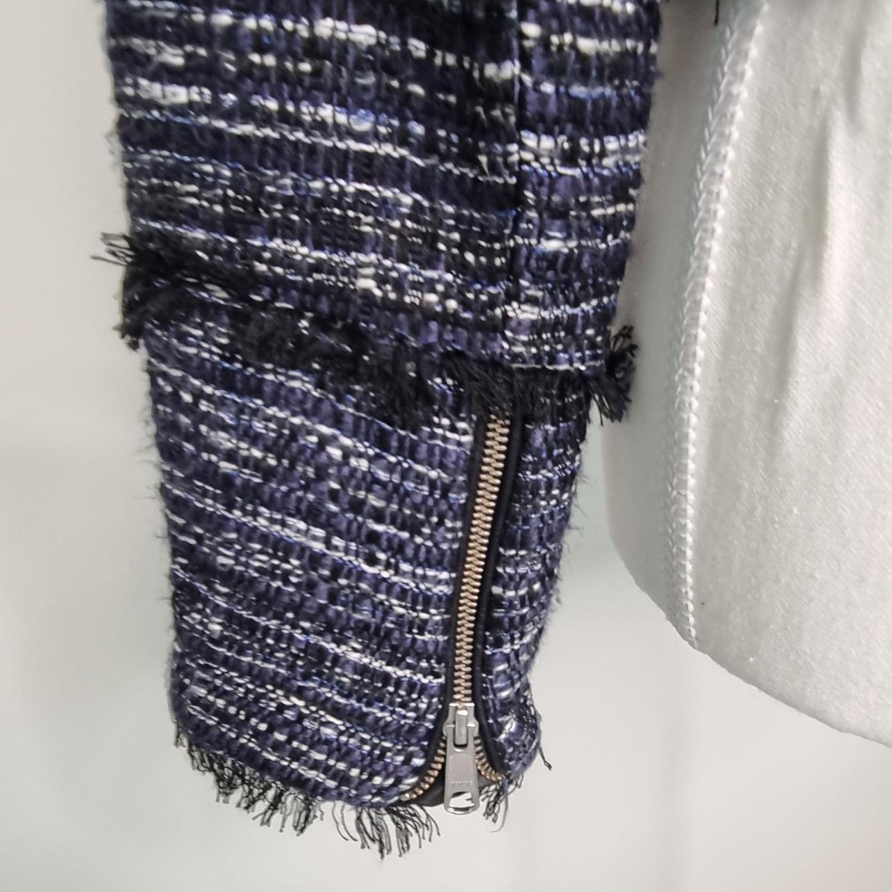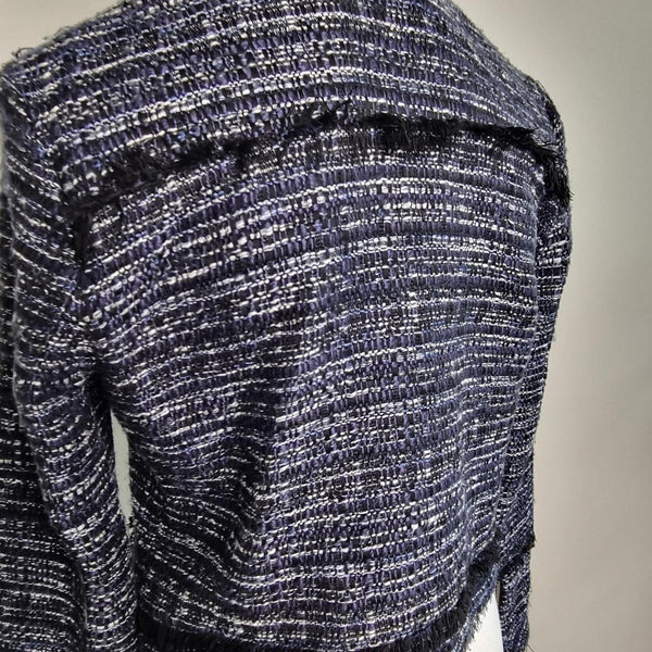 Bardot Cropped Tweed Jacket – Navy/Black – Size 8. Chic and structured Bardot tweed-style cropped jacket in navy, black, and white textured weave. Features an asymmetrical zip front, frayed hemline/edges, and silver-tone hardware for a polished yet edgy vibe. Fully lined for comfort, designed in Australia.