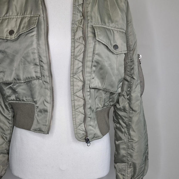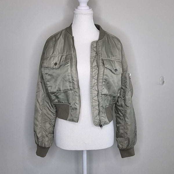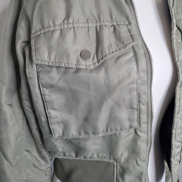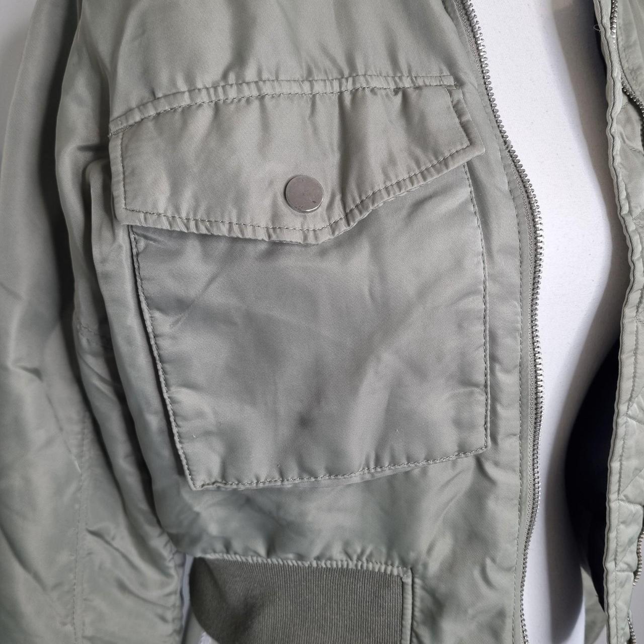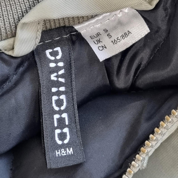 H&M Divided Cropped Bomber Jacket Khaki Green Size S (AU 8 / UK 8 / US 4 / EU 36) Streetwear essential! Classic khaki cropped bomber jacket by H&M Divided. Features ribbed cuffs, hem, and neckline, two chest flap pockets, a sleeve pocket detail, and a full zip closure. Quilted black lining inside for extra comfort and that authentic bomber look. - Brand: H&M Divided - Size: S (AU/UK 8, US 4, EU 36) - Colour: Khaki green - Material: Polyester shell,.
