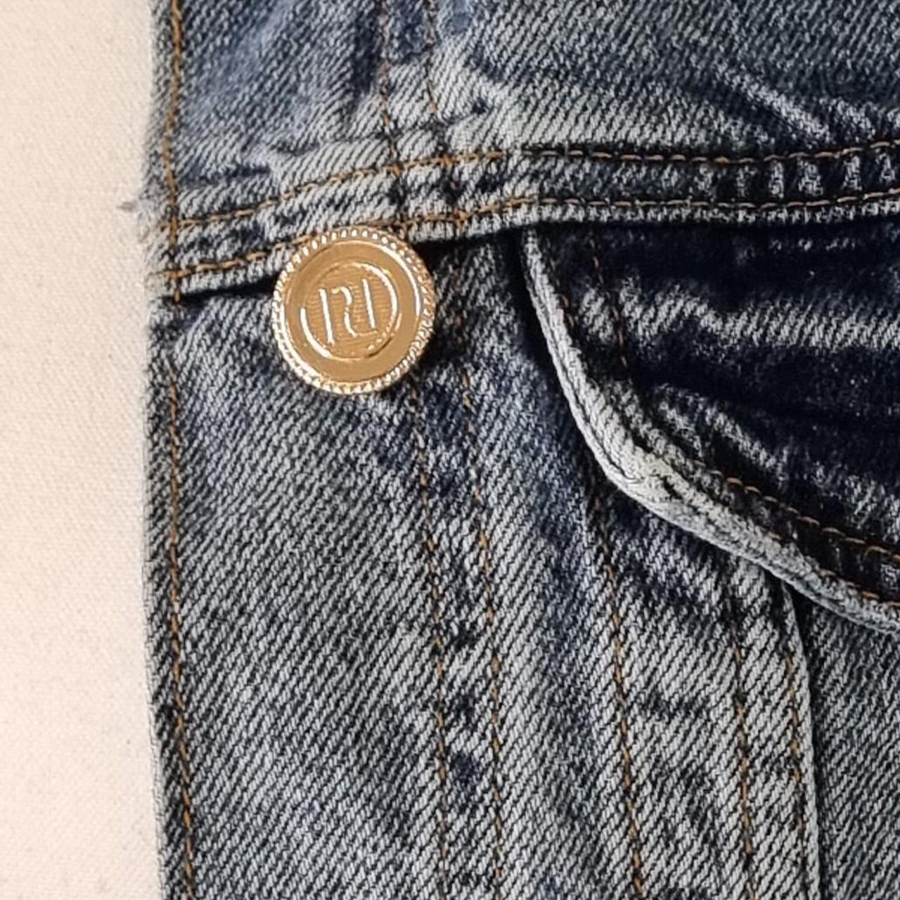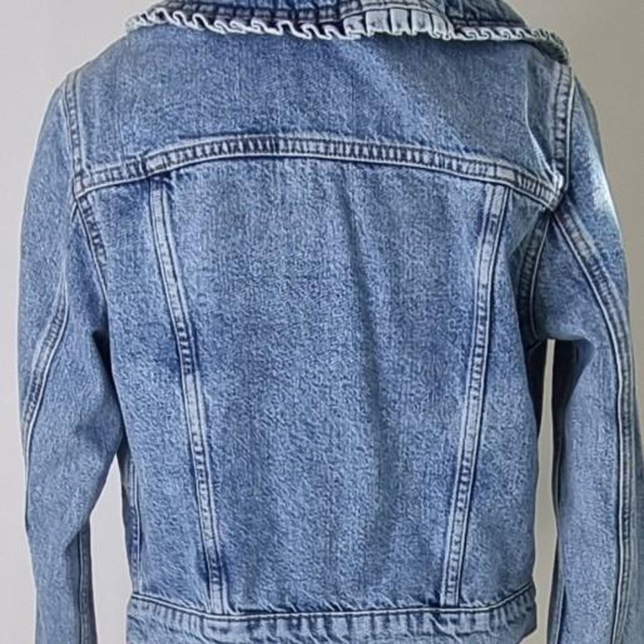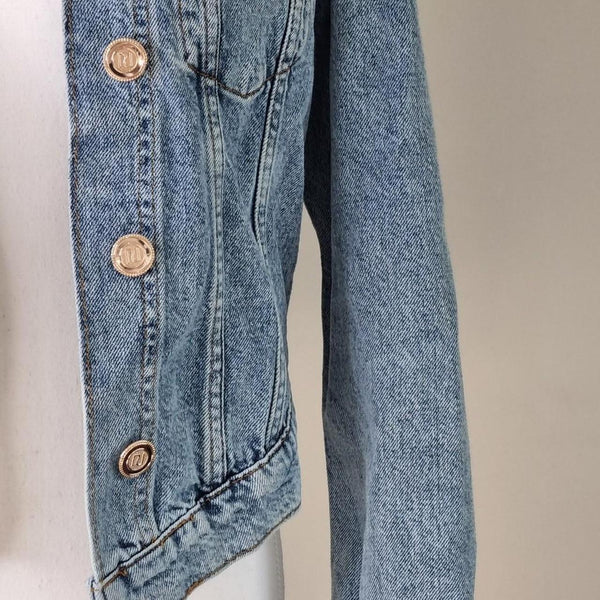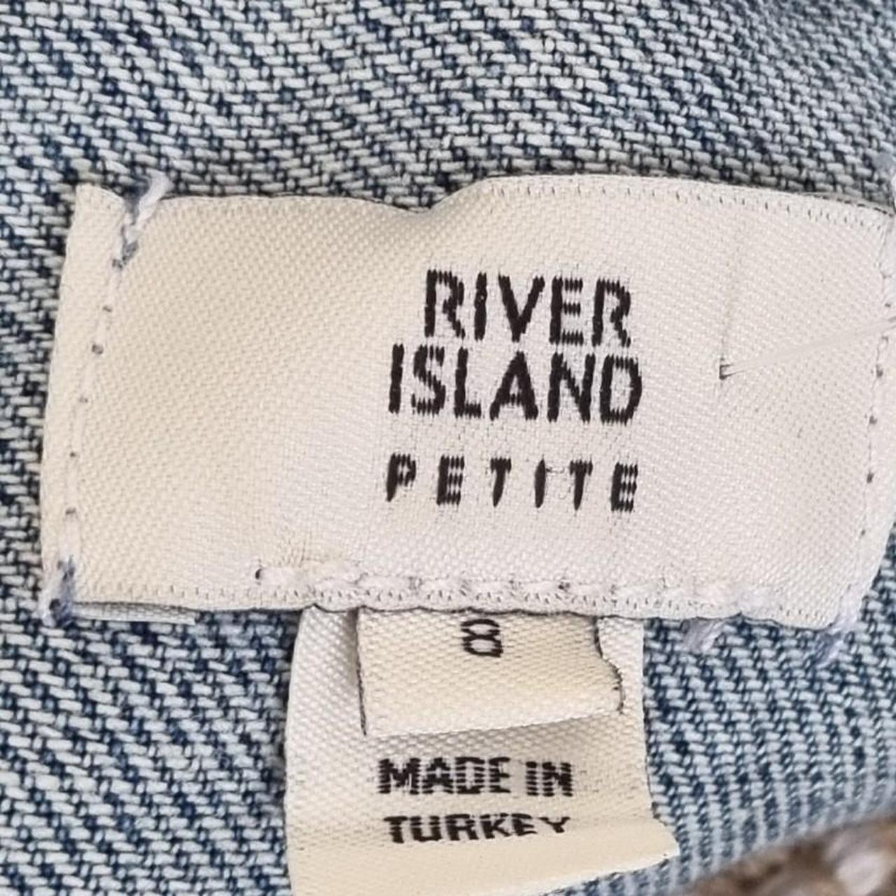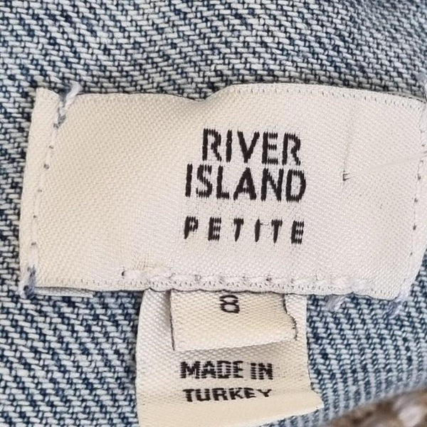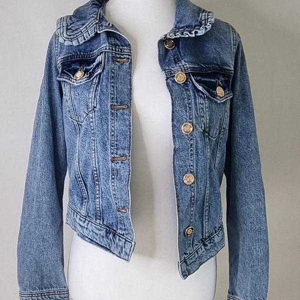 River Island Petite Blue Denim Jacket Size 8. Chic and unique cropped denim jacket by River Island. - Ruffle trim collar detail - Statement gold logo buttons - Chest flap pockets - Fitted cut with slight asymmetric hem - Light wash denim, made in Turkey - Size AU/UK 8 (Petite) - Excellent condition A playful twist on the classic denim jacket perfect for layering over dresses or styling with jeans for a double denim look.