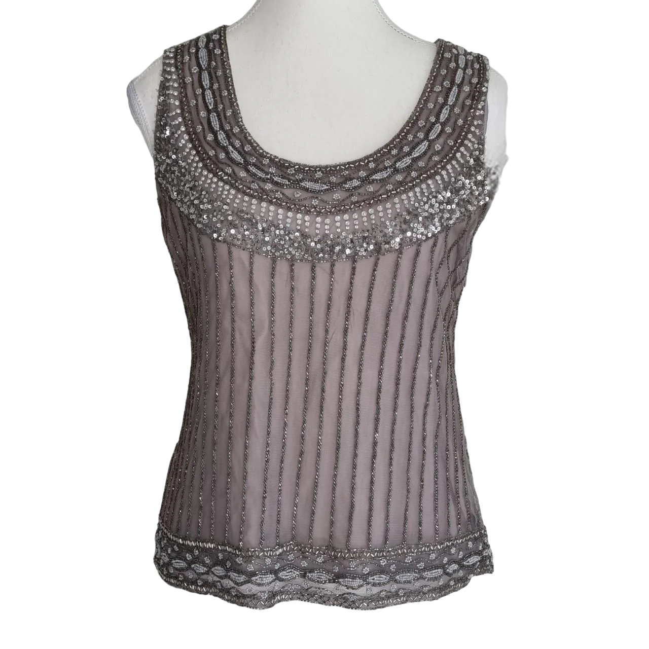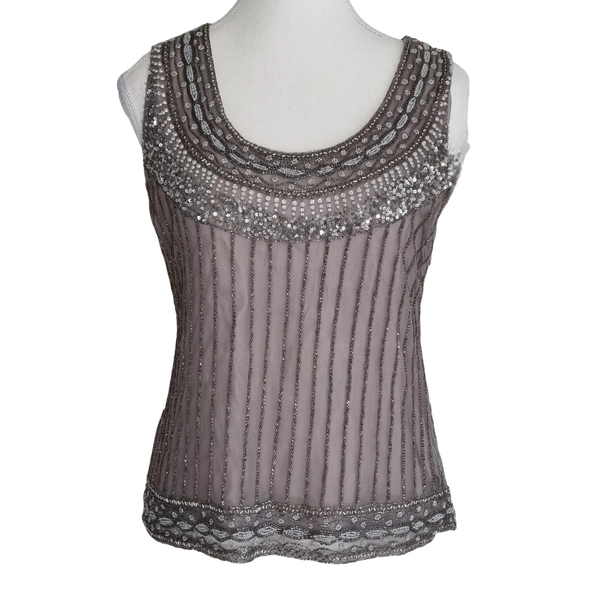 • Colour: Soft taupe/grey base with silver and metallic beadwork & sequins