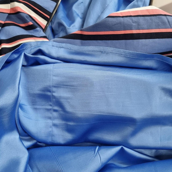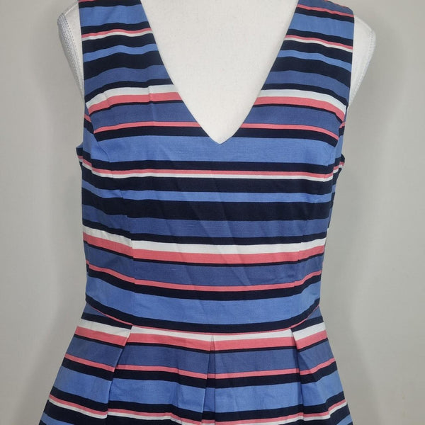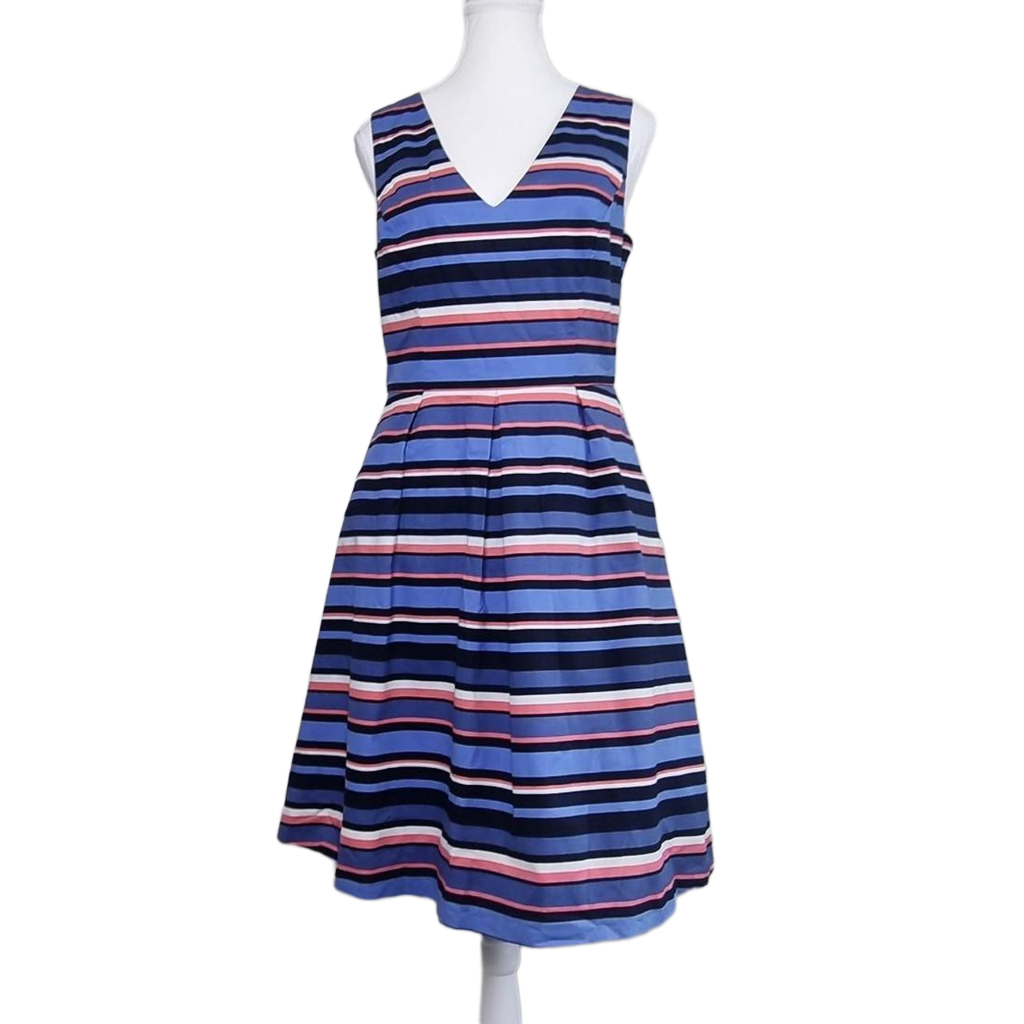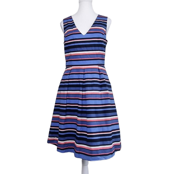 Basque Striped Fit & Flare Dress – Size 10 AU. Classic and flattering sleeveless dress by Basque, featuring a bold multi-coloured stripe pattern in navy, blue, coral, and white. Designed with a V-neckline, fitted waist, and softly pleated A-line skirt for a feminine silhouette. Fully lined for comfort and structure, with an exposed silver zip at the back for a modern touch. Perfect for work, brunch, or summer events.