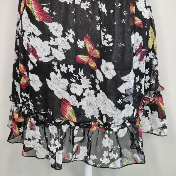 Coco Lace Butterfly Print Crochet Dress. Black chiffon with multicolour butterfly + floral print.