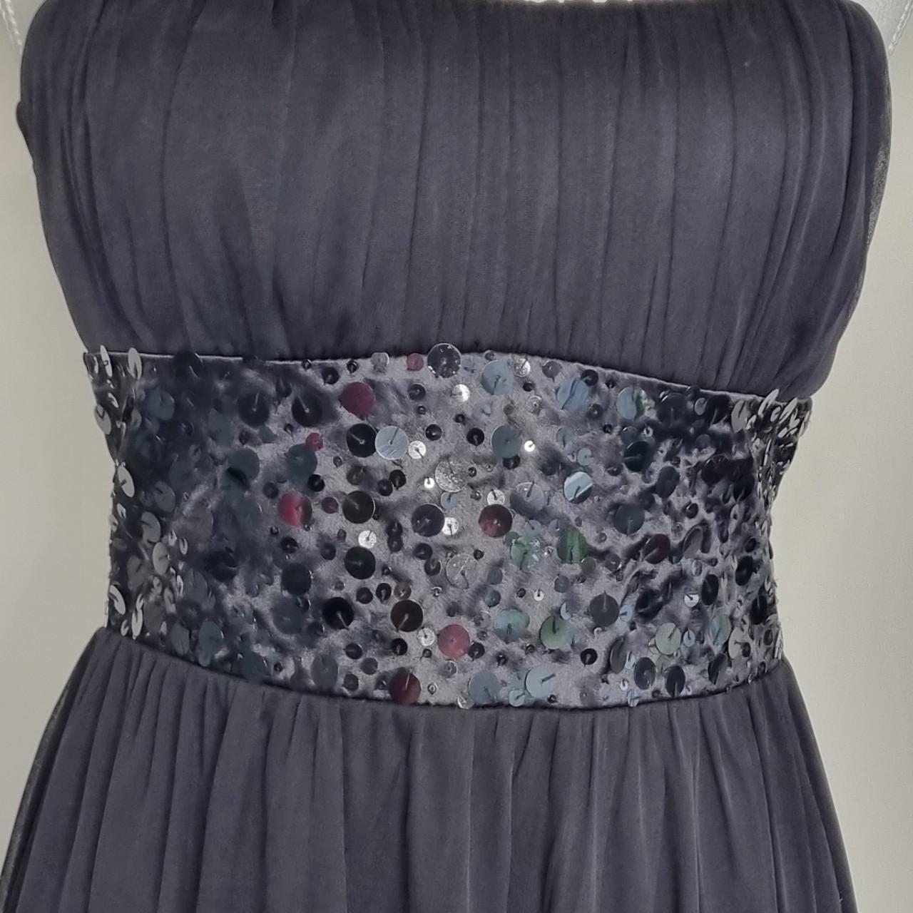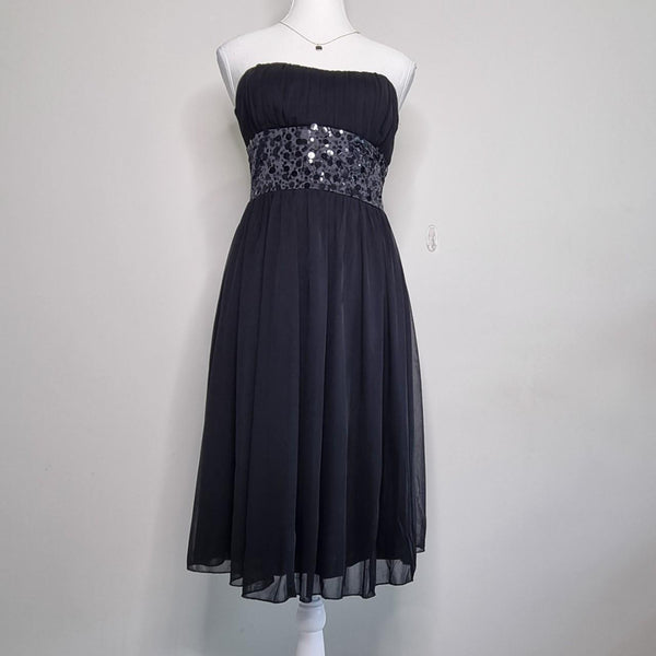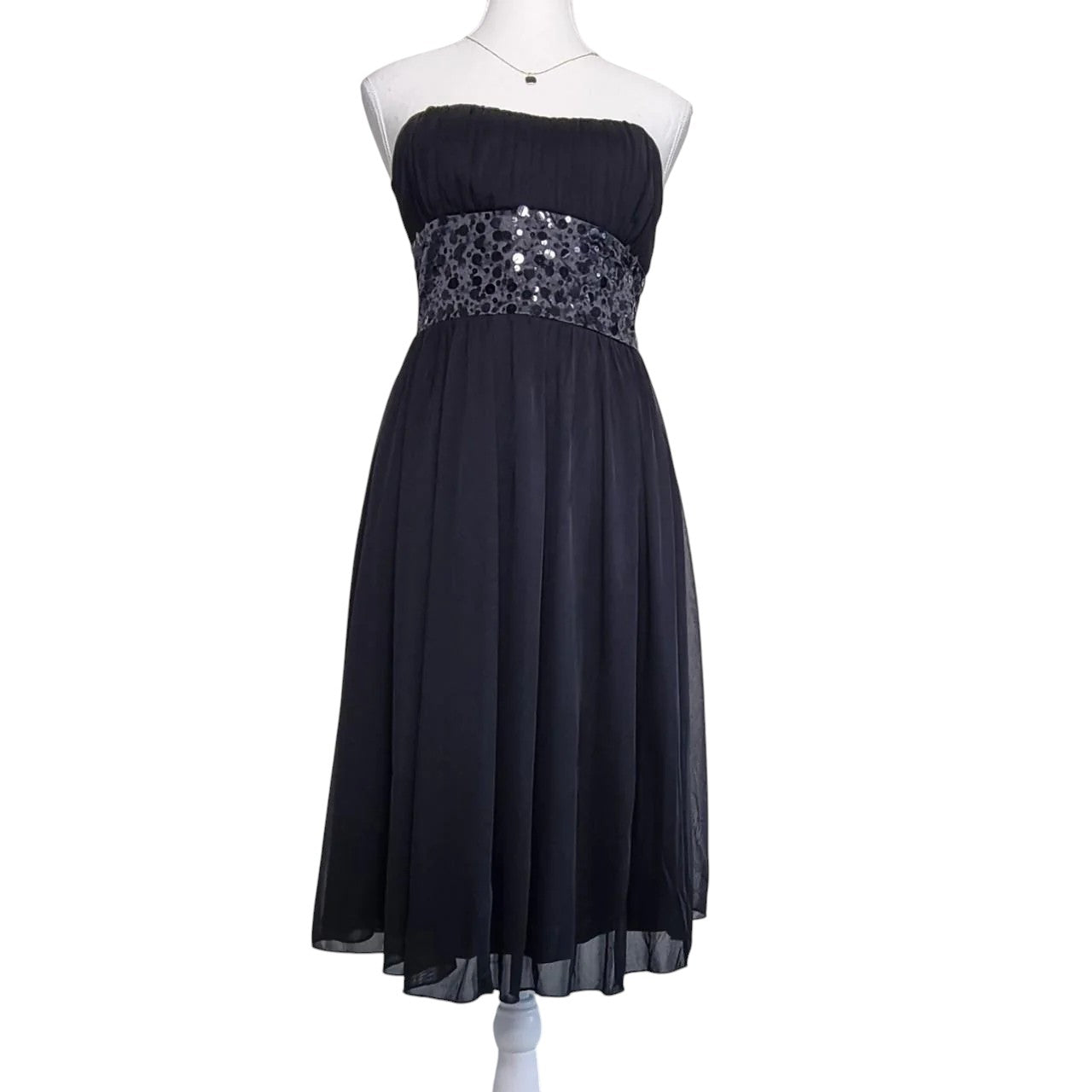 Chic black strapless party dress with a shimmering sequin waistband. Pleated strapless bodice, sequin-embellished waistband, chiffon overlay skirt, zip closure at back. Perfect for parties, cocktail nights, or a school formal.