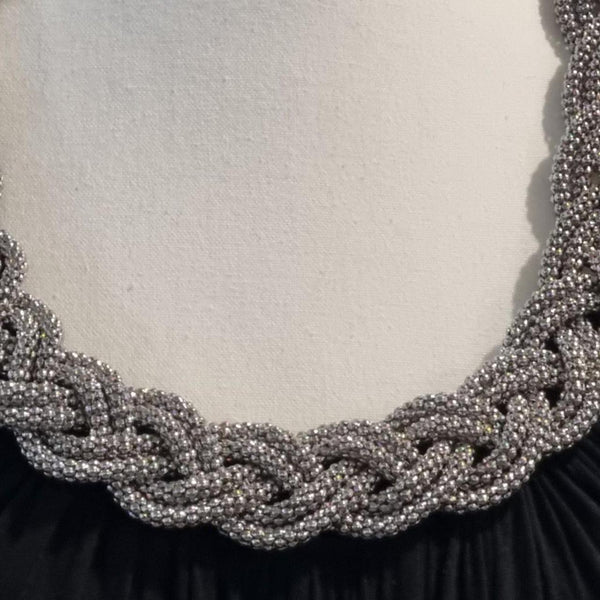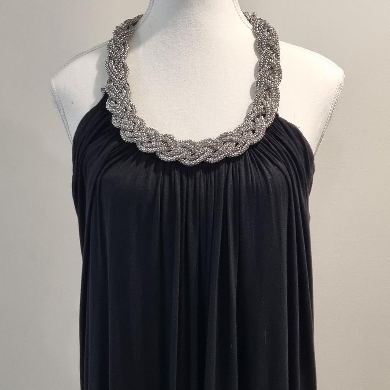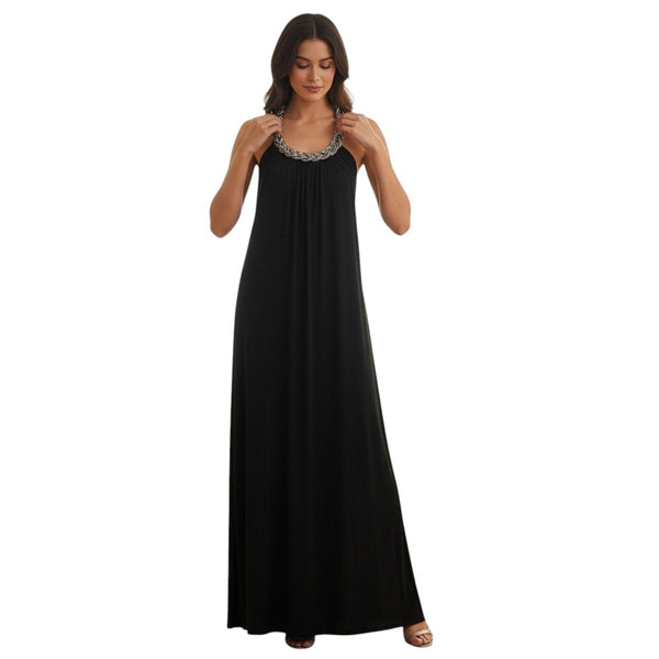 Turn heads in this elegant Kitty Kat black maxi dress, featuring a striking silver braided beaded neckline for a touch of glamour. Crafted from soft, stretch jersey fabric, it drapes beautifully for a flattering silhouette and all-day comfort. Designed with discreet belt loops, allowing you to style it with or without a belt to define the waist.