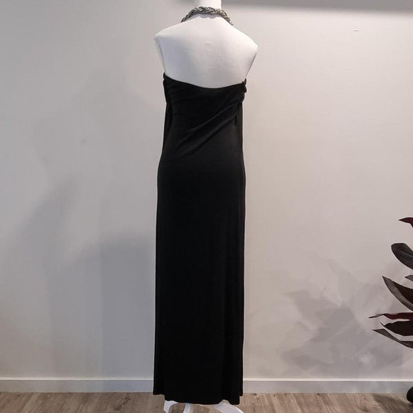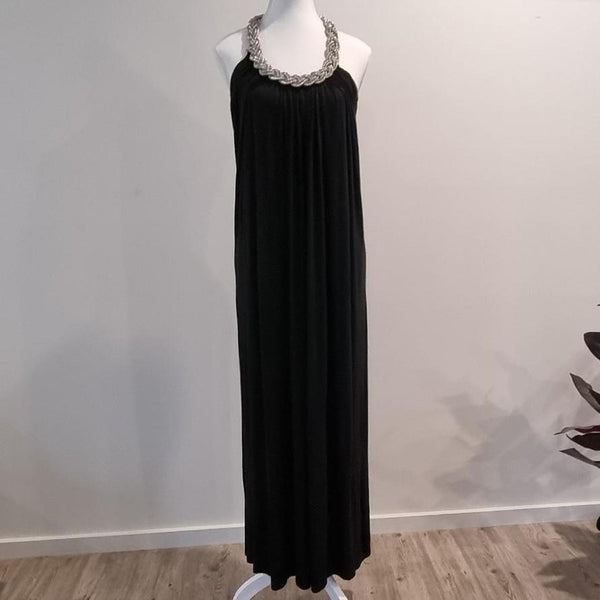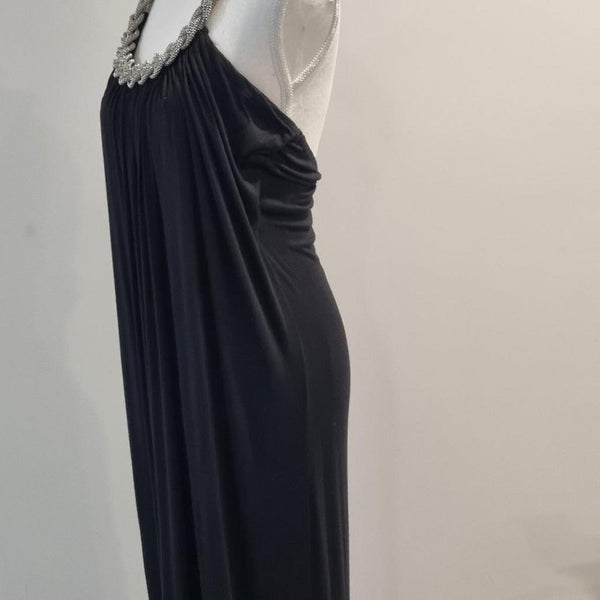Kitty Kat Black Maxi Dress with Silver Beaded Neckline Size 8 AU