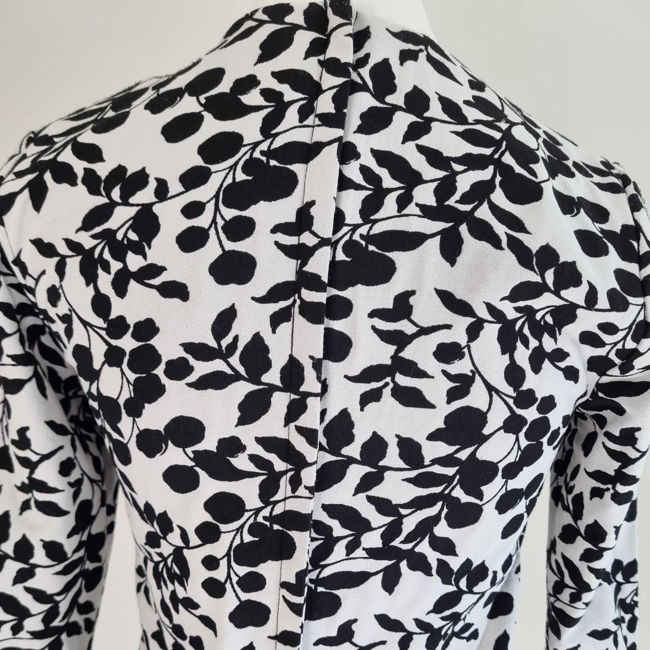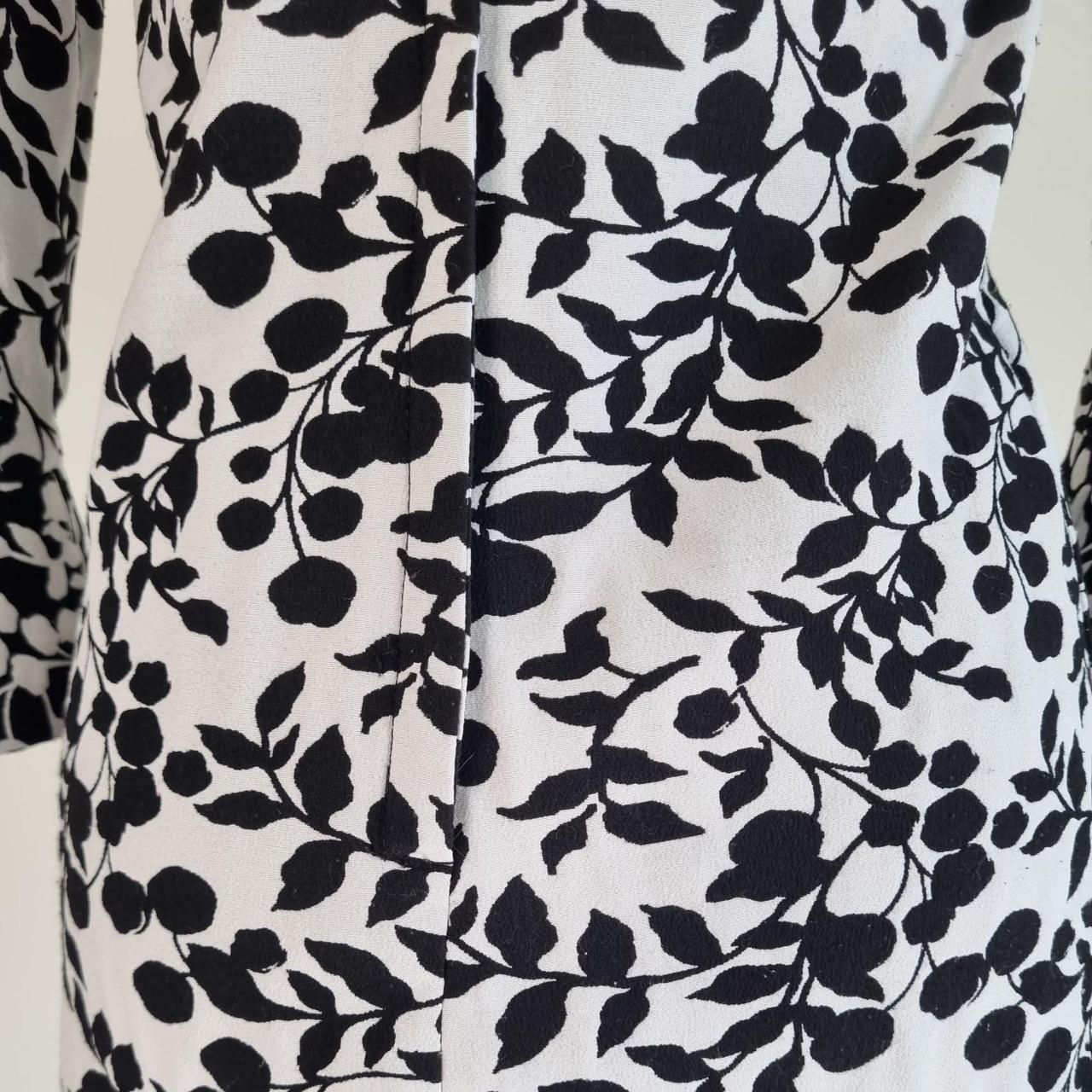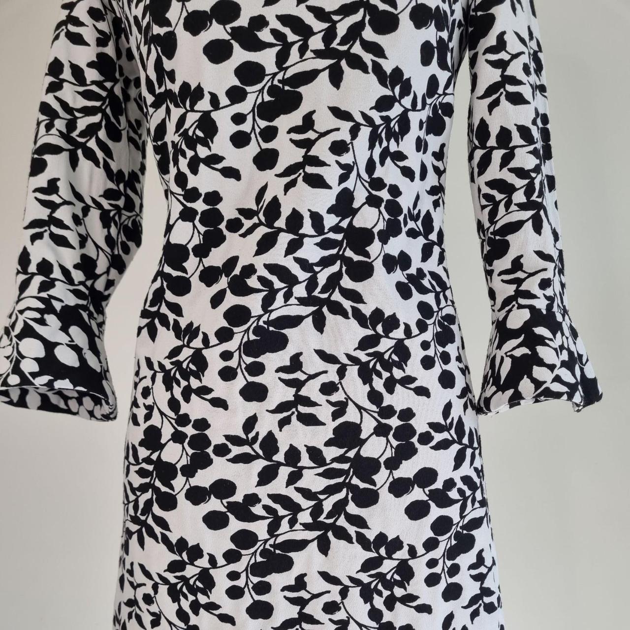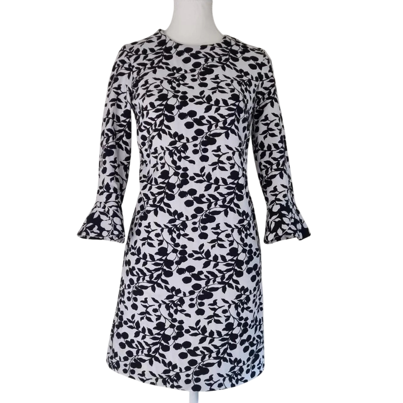 Chic and timeless black and white floral print dress by Miss Selfridge. Features 3/4 length sleeves with feminine ruffled cuffs, a classic round neckline, and a flattering shift silhouette.