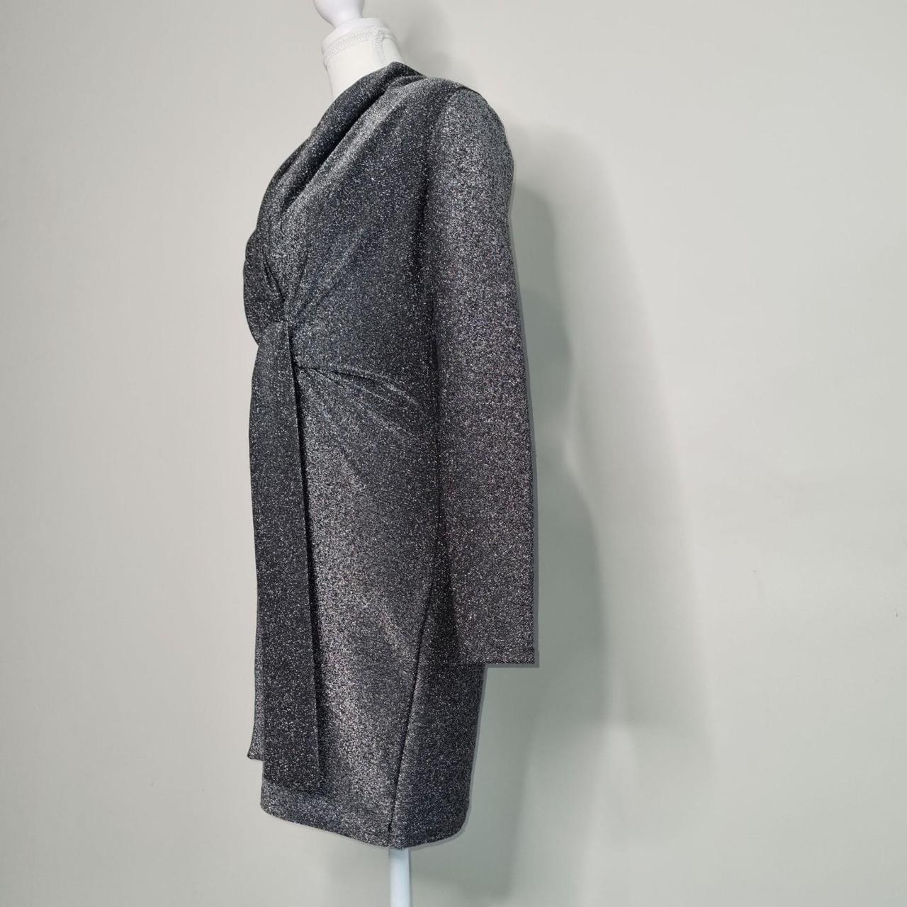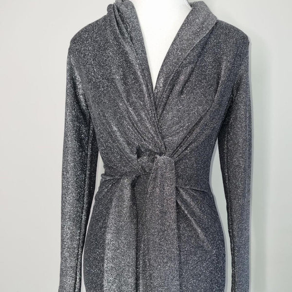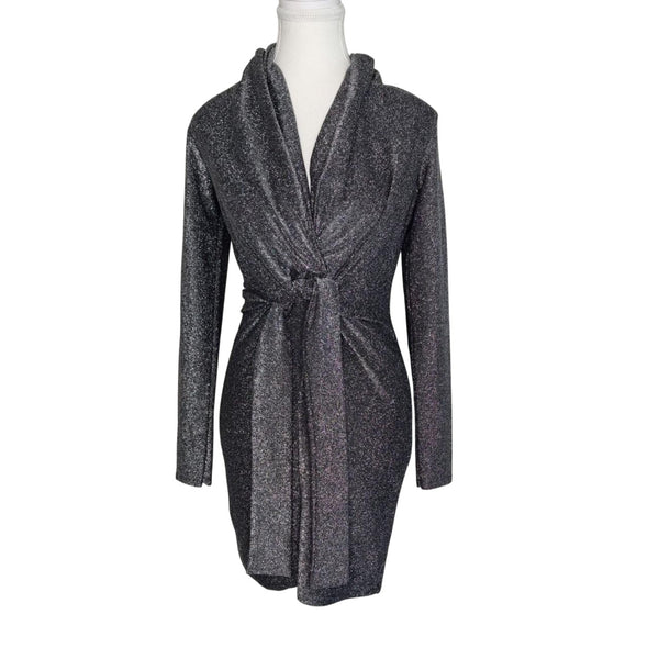 Stand out in this sparkling preloved Motel Rocks party dress. Crafted in metallic silver stretch fabric, it features a deep draped neckline, flattering tie-waist detail, and long sleeves for an effortlessly chic silhouette. Perfect for nights out, cocktails, birthdays, or festive season events. A statement piece that’s guaranteed to turn heads.