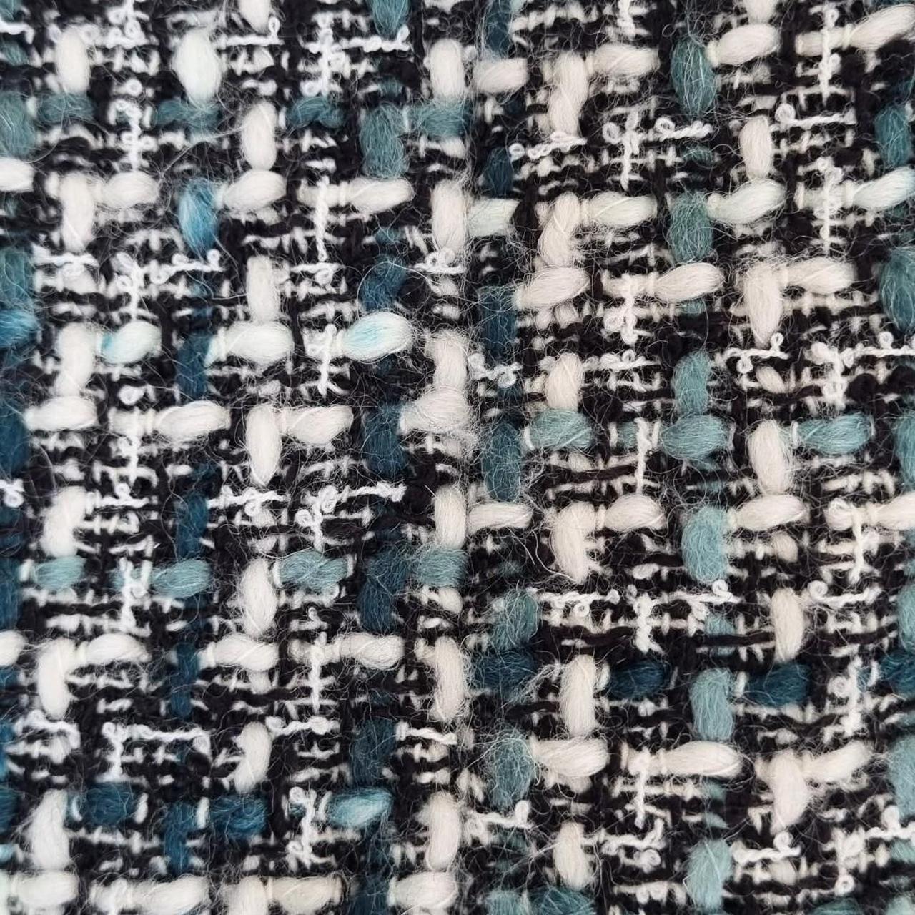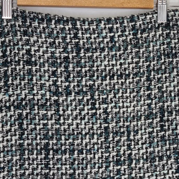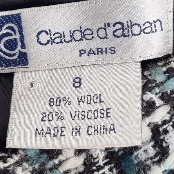 Chic and timeless, this Claude d’alban Paris skirt is crafted from a luxurious 80% wool blend with 20% viscose, making it warm, structured, and comfortable. Monochrome tweed weave with hints of teal, it’s a versatile piece that works year-round