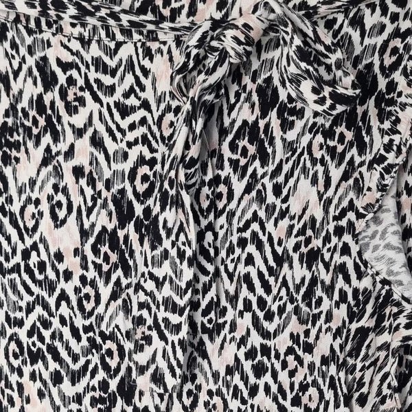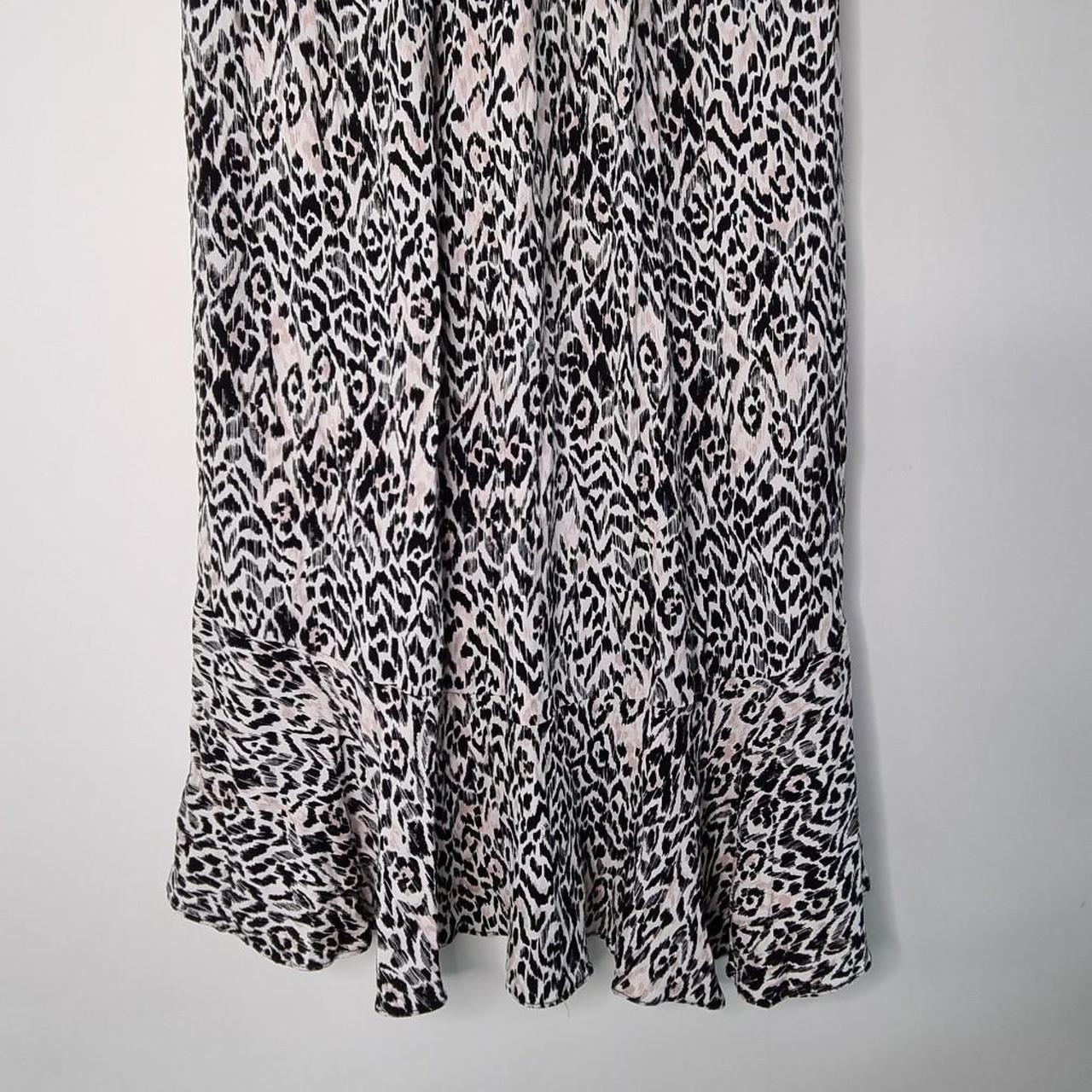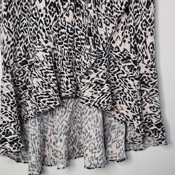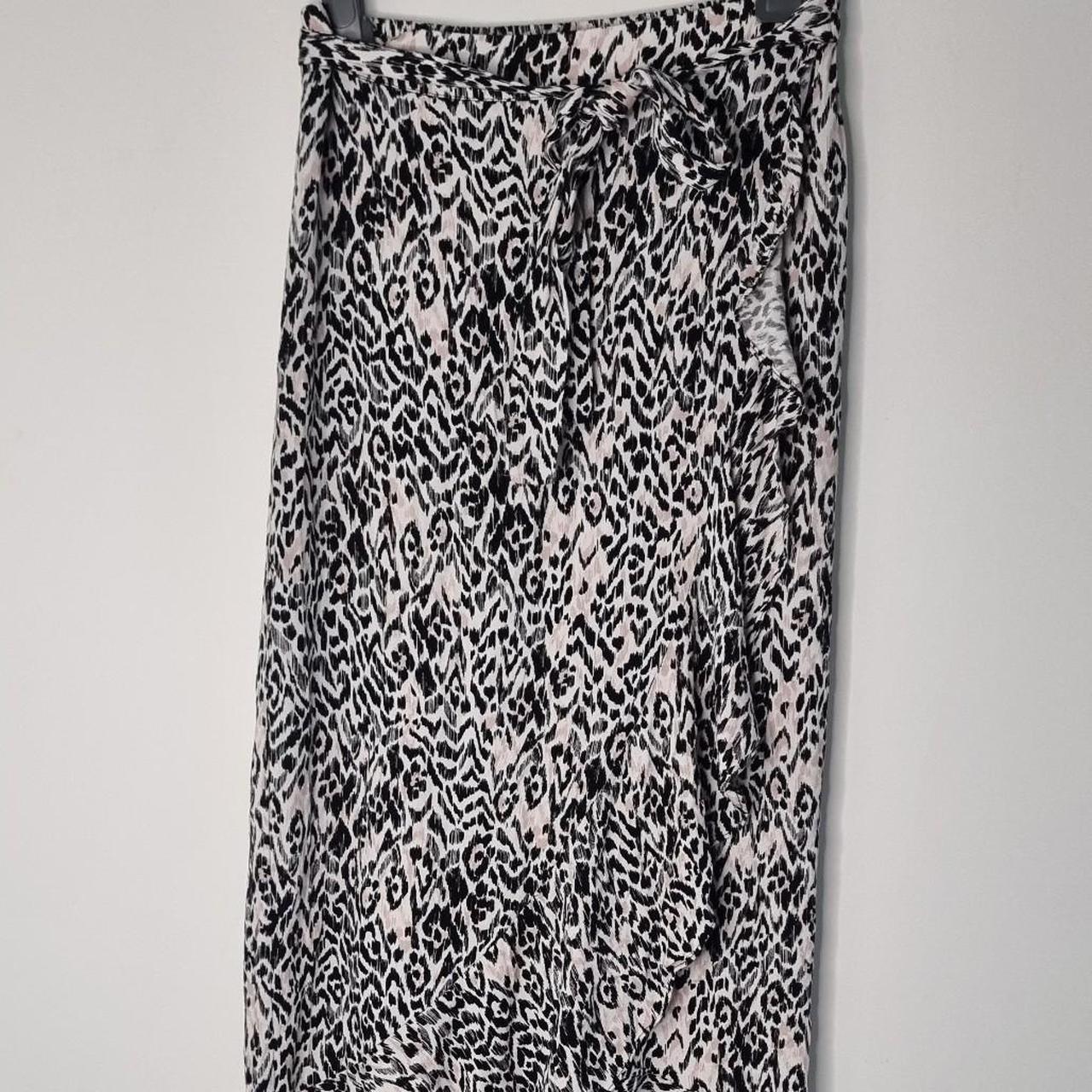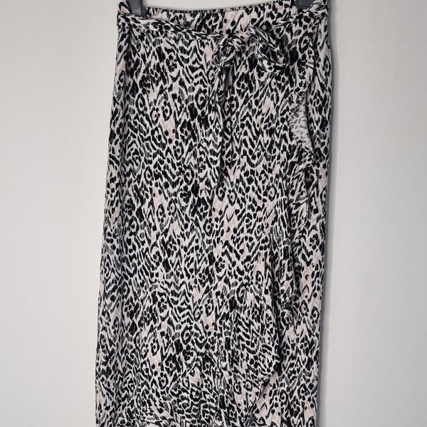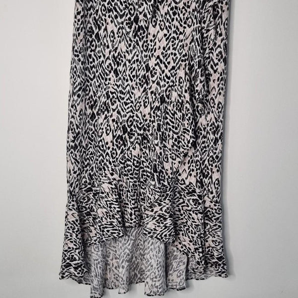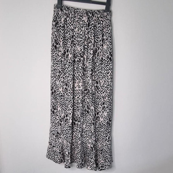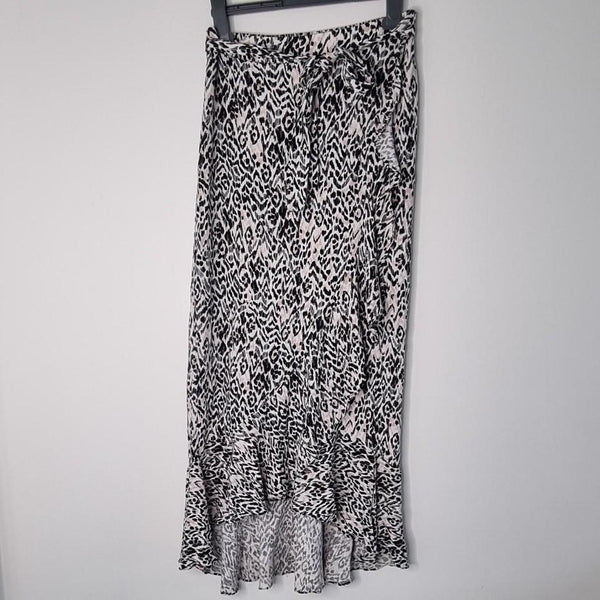 Decjuba Black and white leopard print midi skirt with ruffle hem. Elastic waist with tie.