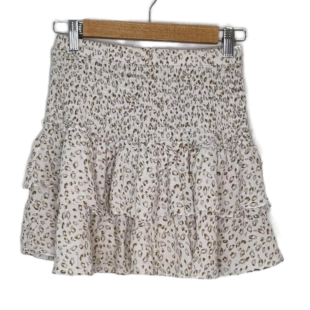 Luvalot Cream leopard print mini skirt with ruffle detail. Elastic waist.