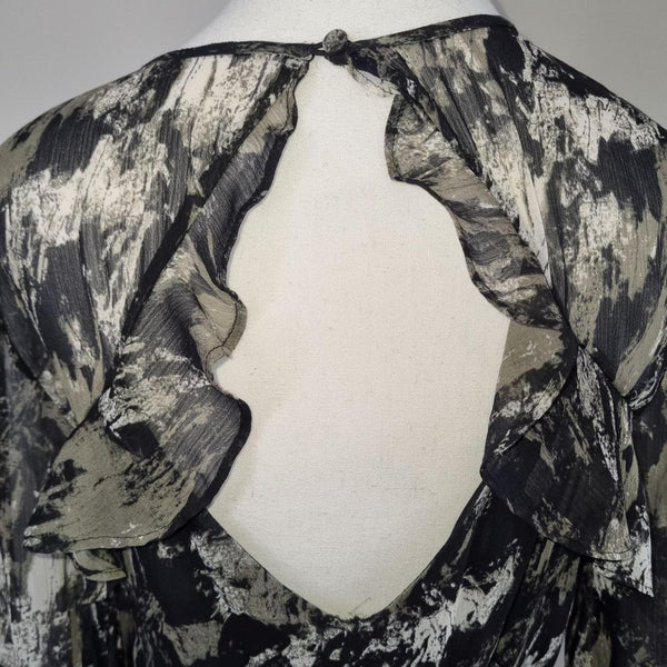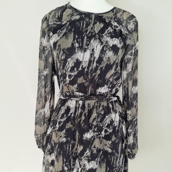 Elegant and versatile Witchery midi dress featuring a striking monochrome brushstroke print. Designed with long sheer sleeves, a cinched waist with tie belt, and a feminine ruffle detail at the back neckline. Fully lined for comfort and finished with a back button fastening.