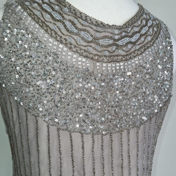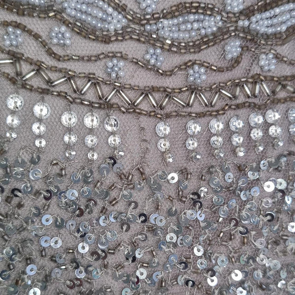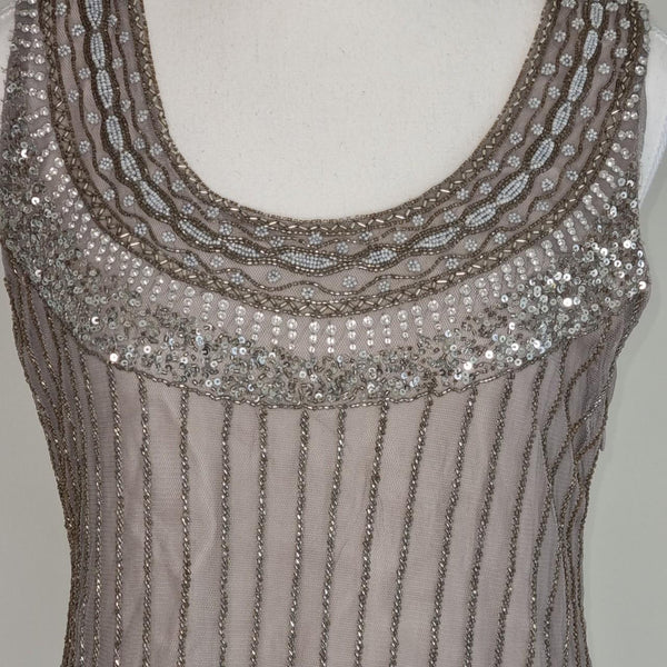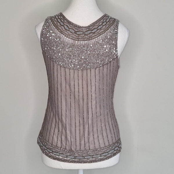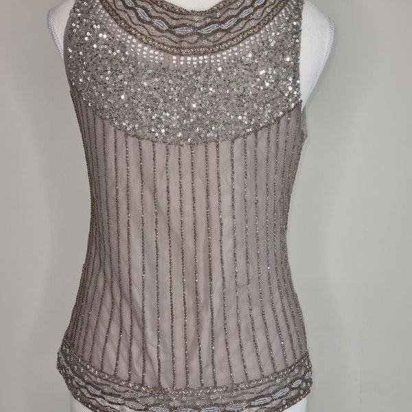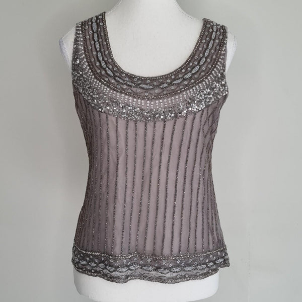 Alannah Hill Lovely Little Sparkle Beaded Sequin Silk Top Size 12 Shine in this glamorous Alannah Hill Lovely Little Sparkle Top, designed in Australia and crafted with intricate hand-beaded embellishments. Hand-applied sequins, glass beads & faux pearls throughout. Decorative beading at neckline and hemline for a luxe finish. Fully lined in silk satin for comfort and a premium feel - Brand: Alannah Hill - Size: AU 12 - Colour: Soft taupe/grey base with.