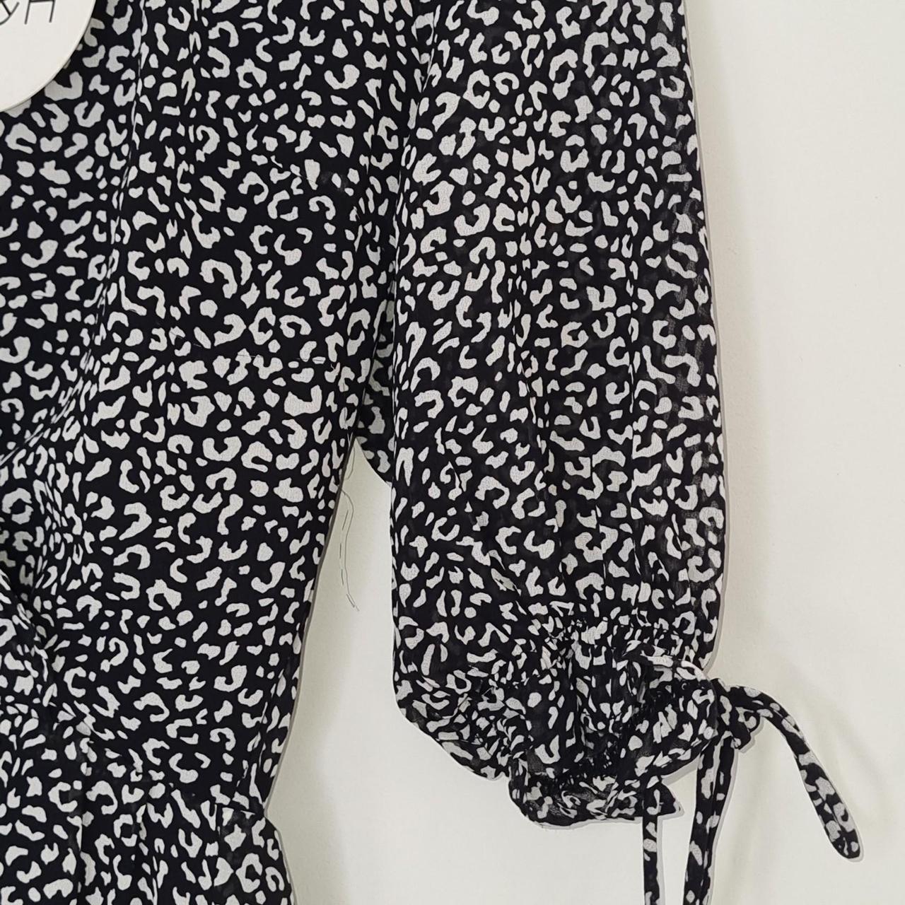 - Style: Puff sleeve, mini length, fitted waist, animal print