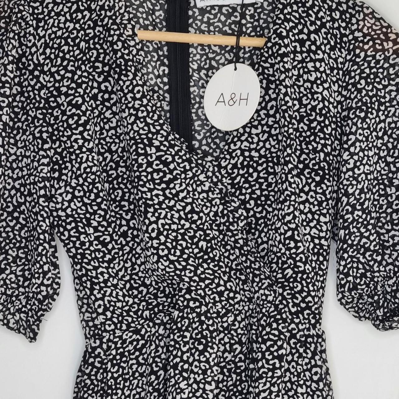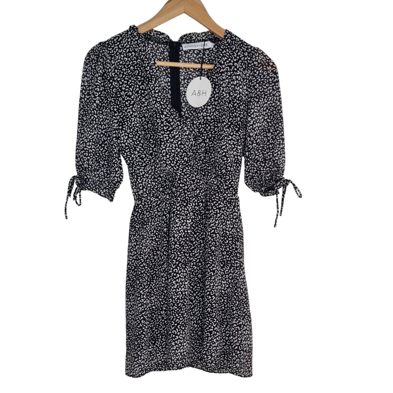 Chic and versatile Atmos & Here mini dress, brand new with tags. Features a subtle black & white animal print, flattering fitted waist, and puff sleeves with tie details. The lightweight fabric and back zip closure make it easy to wear for both day and night looks. Pair with sneakers for a casual look or dress up with heels and a blazer for a chic evening outfit.