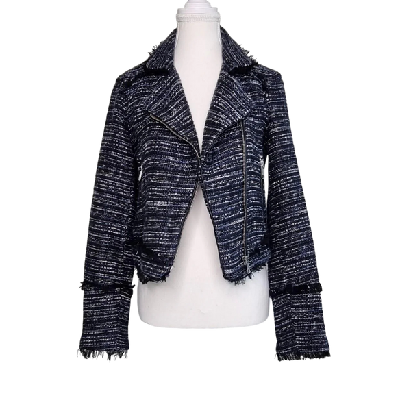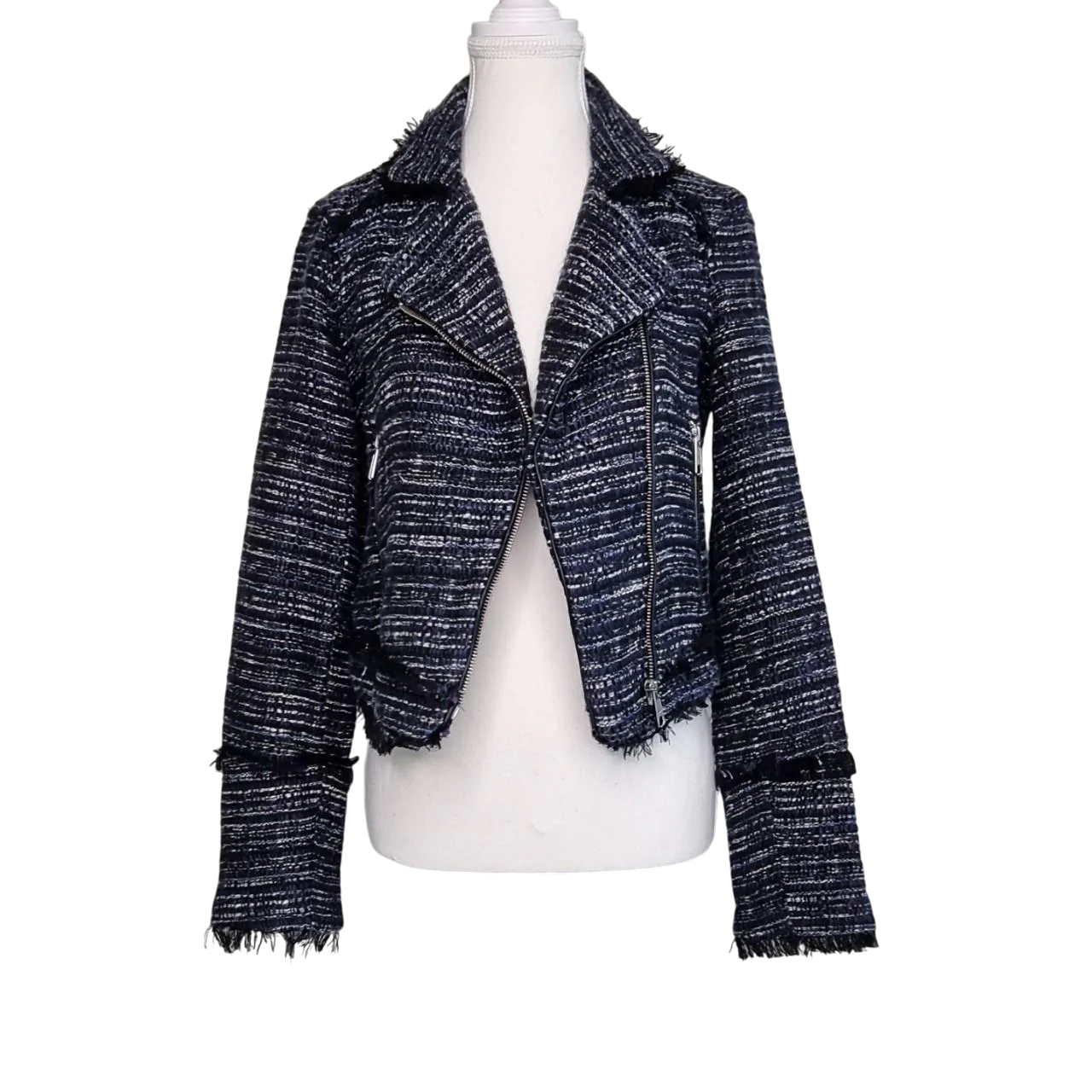 Bardot Cropped Tweed Jacket – Navy/Black – Size 8. Chic and structured Bardot tweed-style cropped jacket in navy, black, and white textured weave. Features an asymmetrical zip front, frayed hemline/edges, and silver-tone hardware for a polished yet edgy vibe. Fully lined for comfort, designed in Australia.