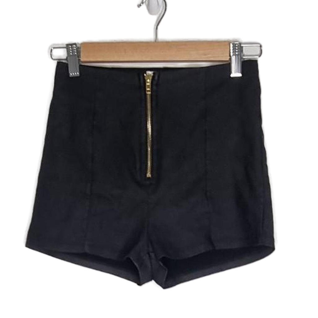 Black faux leather wet look shorts by That's So Fetch. Gold zipper.