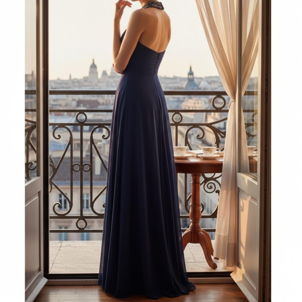 Turn heads in this absolutely stunning long formal dress from Black Label Contony. Crafted in a rich navy blue, it features elegant ruching across the bodice, a flowing skirt, and a striking beaded neckline for a touch of glamour. Perfect for weddings, formal events, and evening occasions.