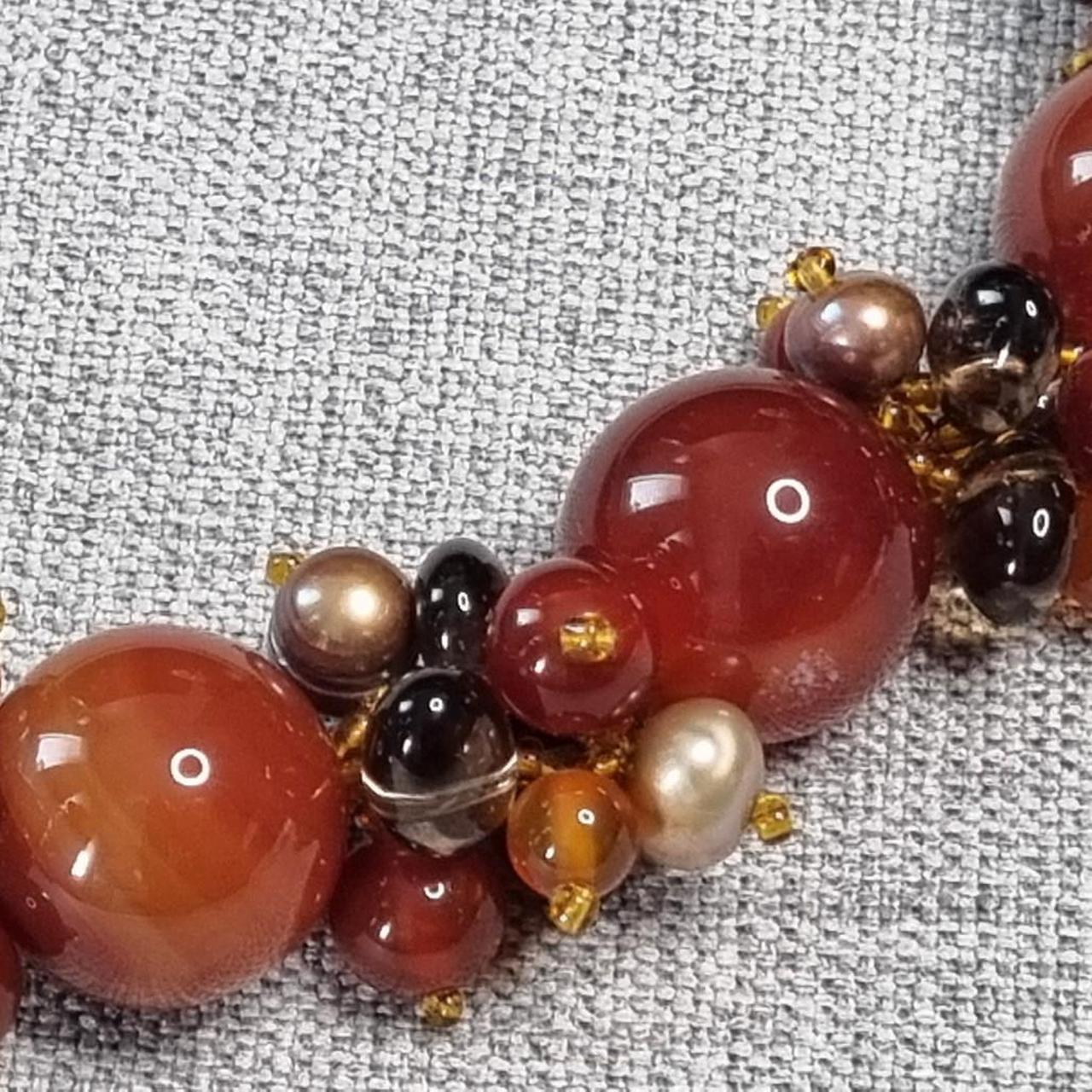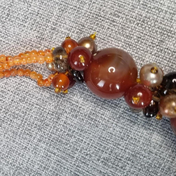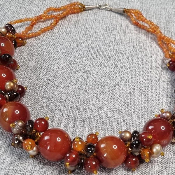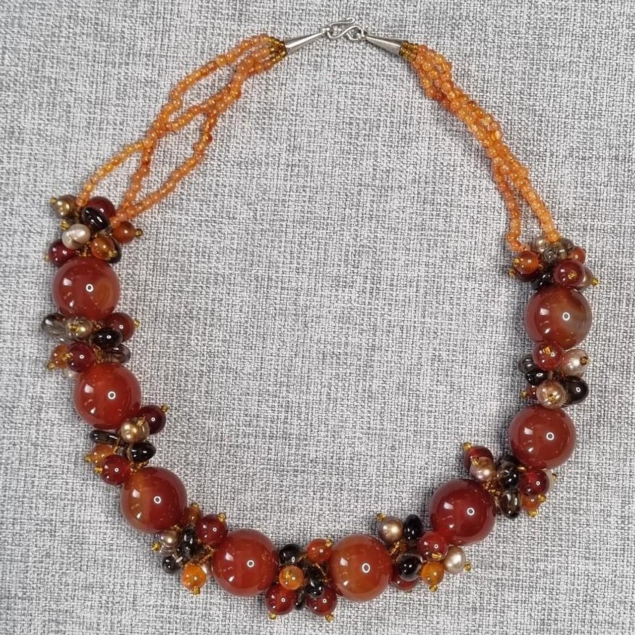 Stunning carnelian and garnet gemstone beaded necklace with a rich, earthy colour palette and a chic bohemian vibe. Features large polished carnelian beads paired with clusters of garnet, accented by metallic and glass seed beads for added texture and depth.