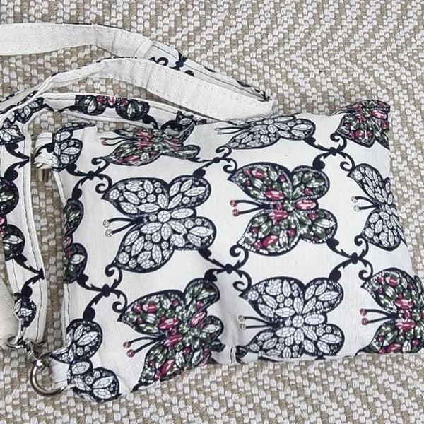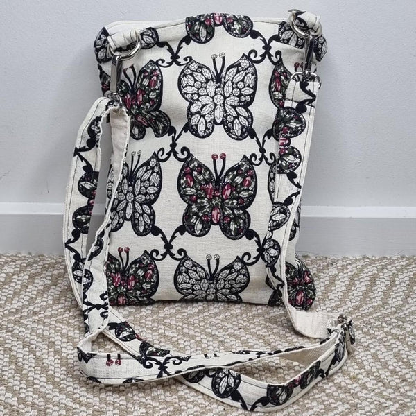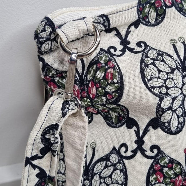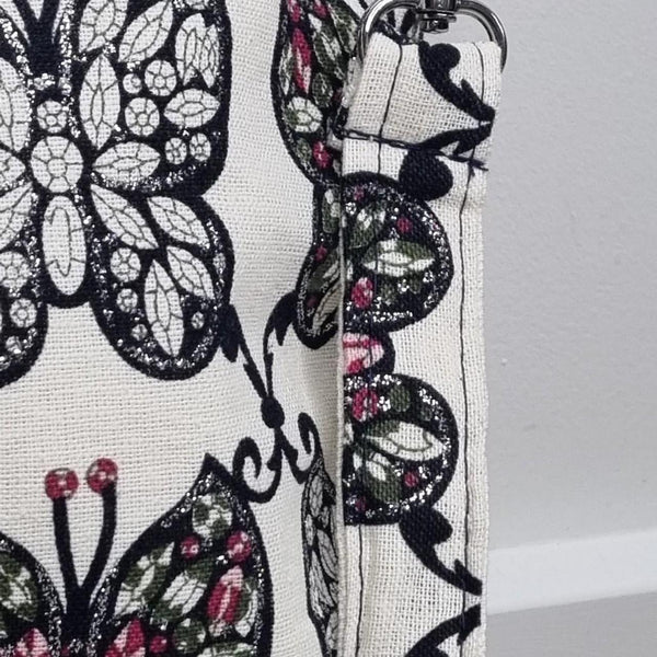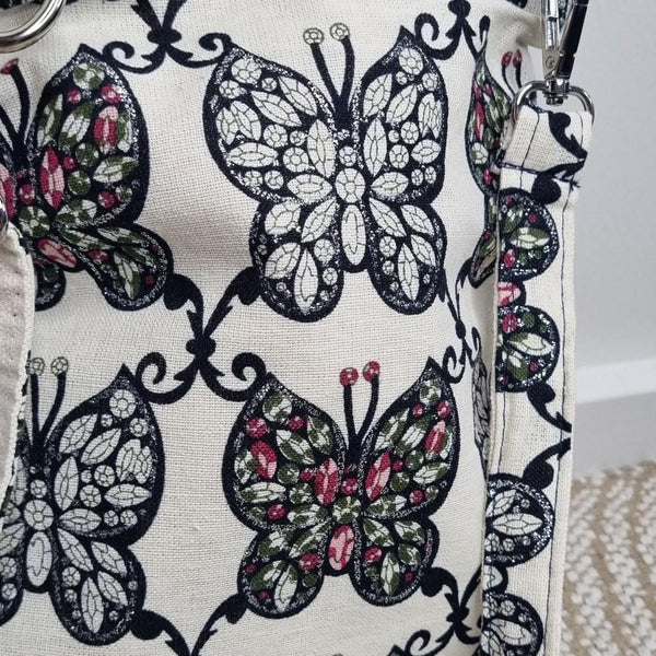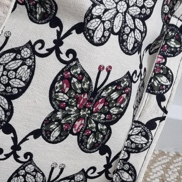 Chic and lightweight Butterfly Print Crossbody tote Bag with a subtle metallic sparkle finish on the butterfly designs. Made from a cream canvas-style fabric with black, green, and pink butterfly patterns that shimmer when the light hits. Features multiple zip compartments for secure storage and an adjustable strap for versatile wear. - Colour: Cream with black, green & pink butterfly print (with metallic sparkle) Material: Canvas-style fabric - Style:.