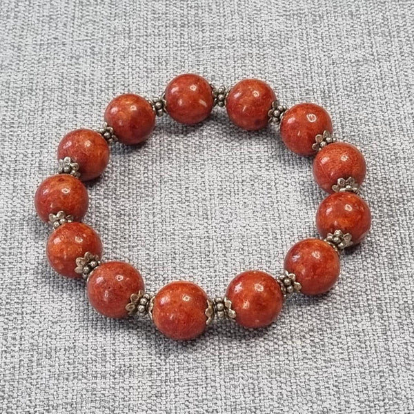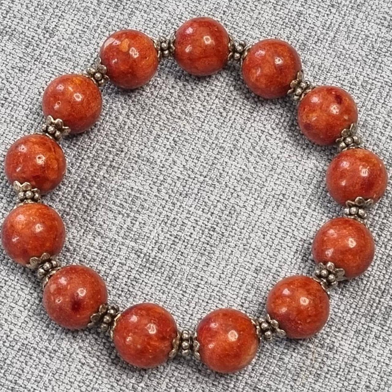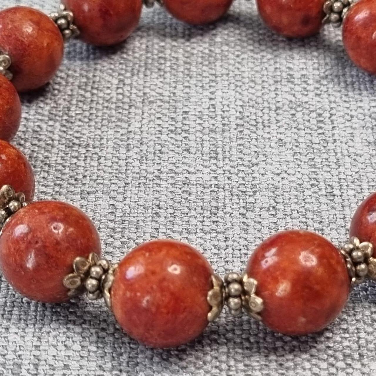 Beautiful coral and sterling silver beaded bracelet featuring vibrant red-orange coral beads accented with ornate sterling silver spacers. Crafted on a durable stretch cord for comfort and easy wear.