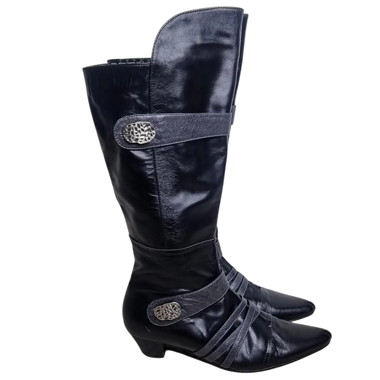 Striking tall leather boots by Django & Juliette with a chic Western-inspired edge. Featuring a pointed toe, low block heel, and unique grey strap detailing with silver hardware. Crafted from smooth genuine leather with side-zip closure for easy wear.