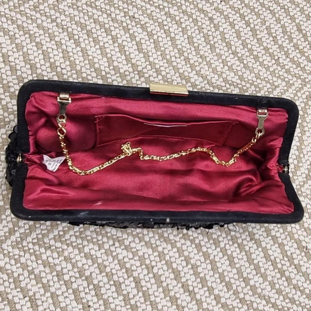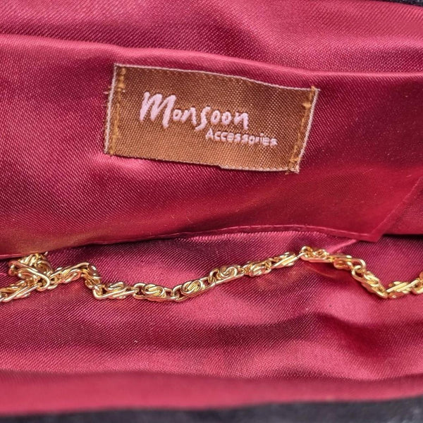 Elegant Monsoon Accessories Black Sequin Clutch Bag with gold chain strap. Features shimmering black sequins on the exterior, a structured frame with clasp closure, and a rich burgundy satin interior with slip pocket. Perfect for evening wear, formal events, or special occasions.