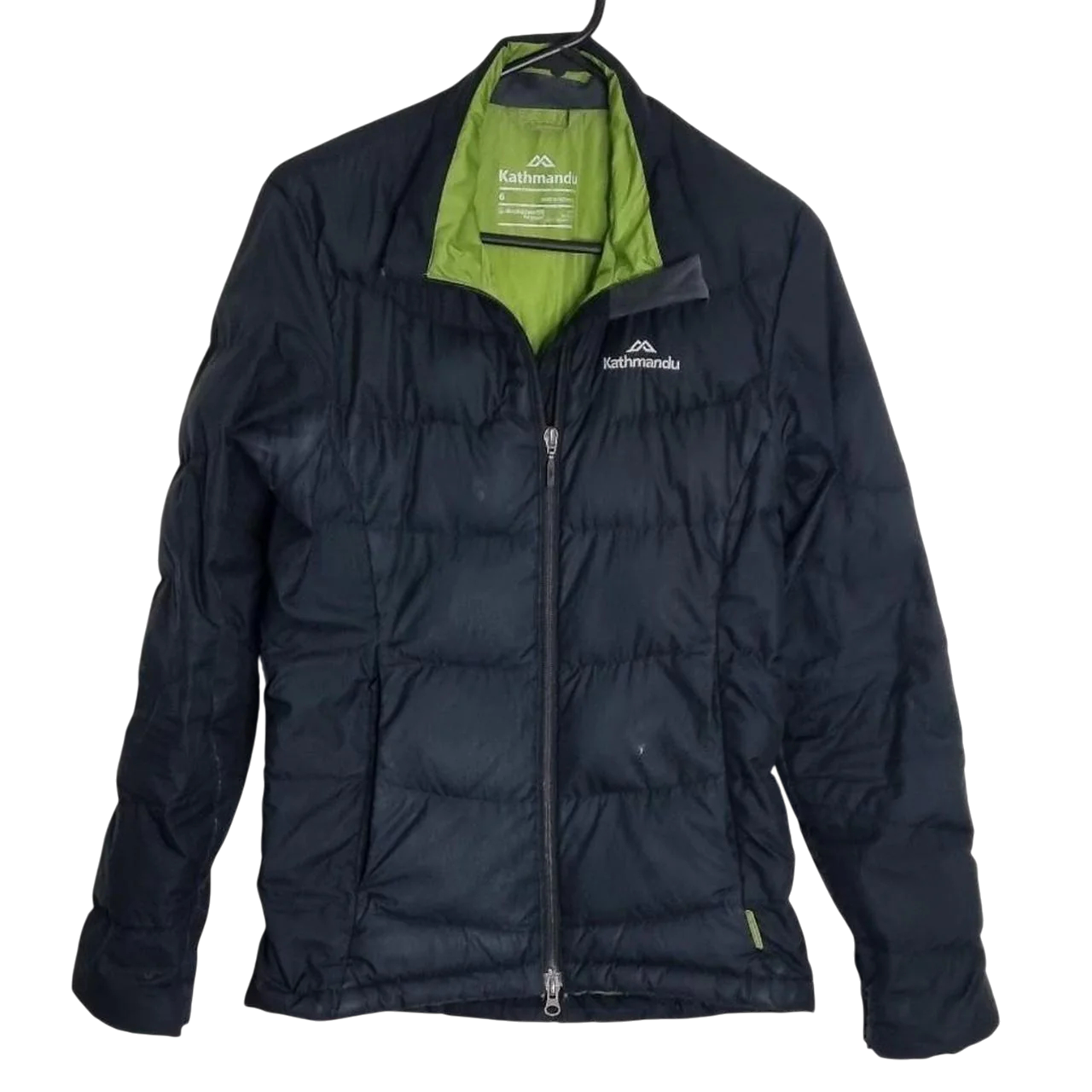 Kathmandu Women’s Puffer Jacket Black Green Lining Plus Bag Size AU 6
