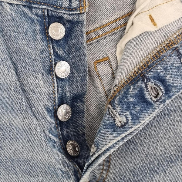 Iconic button-fly style crafted from sturdy mid-wash denim with heavy distressed detailing and raw frayed hems for that lived-in vintage edge.
