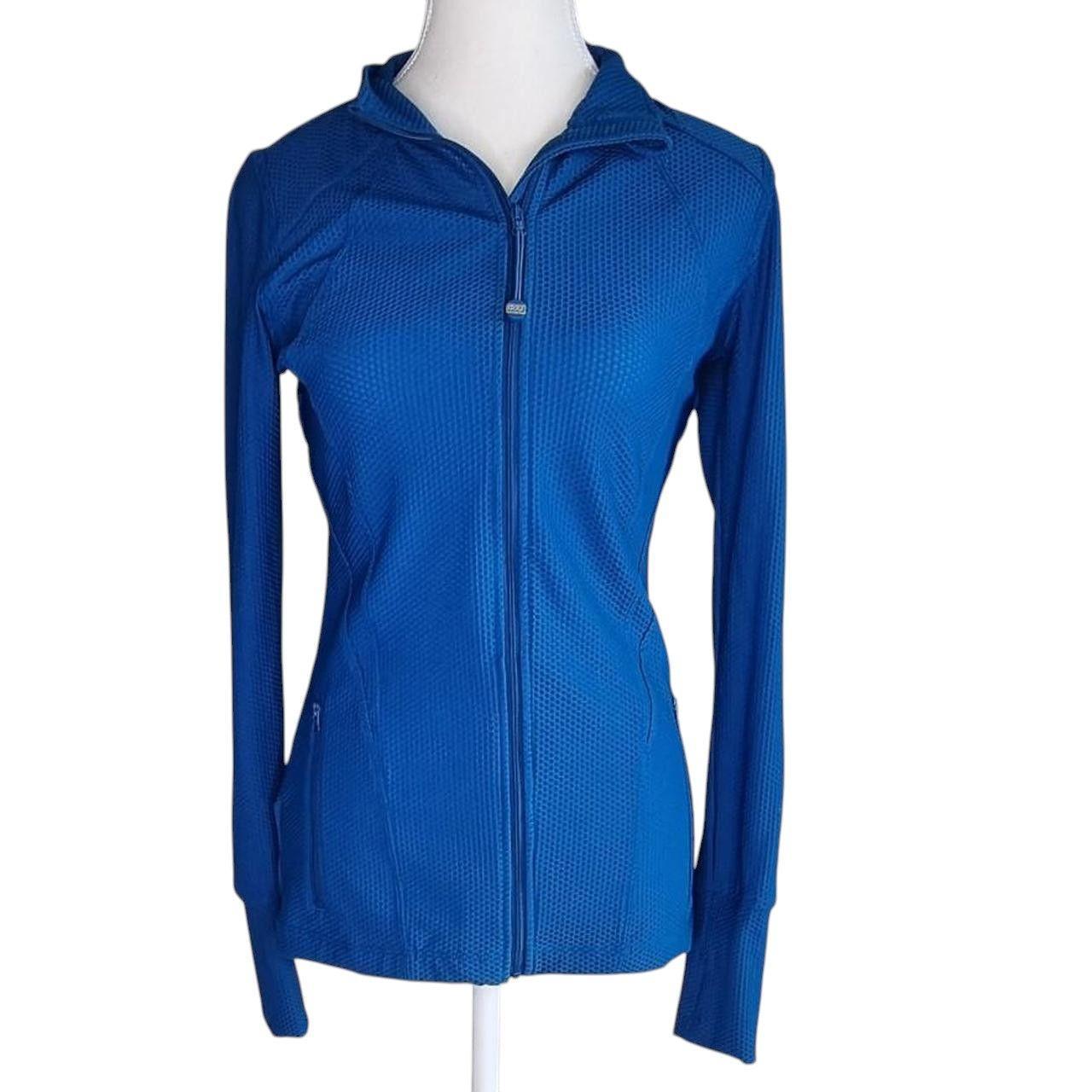 Lorna Jane Blue zip-up mesh jacket with thumb holes and 2 front pockets..