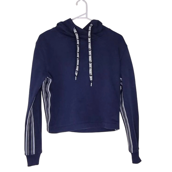 Sporty and stylish cropped hoodie from Lorna Jane in navy blue with white stripe detailing on the sleeves. Features a drawstring hood with branded ties and a relaxed cropped fit. Perfect for layering over your activewear sets or pairing with high-waisted leggings for the gym, pilates, or casual wear. A comfy, versatile piece that combines athleisure style with everyday wear.