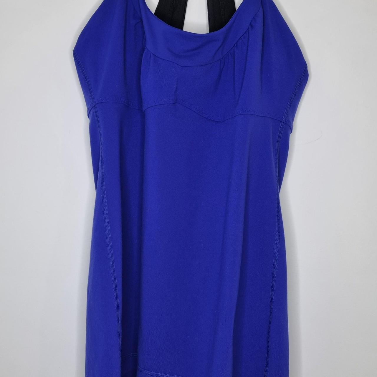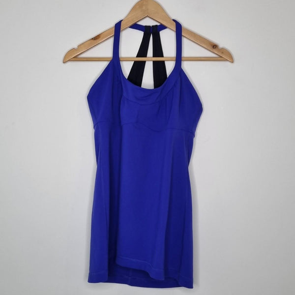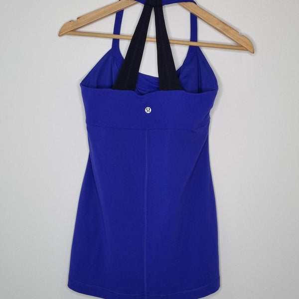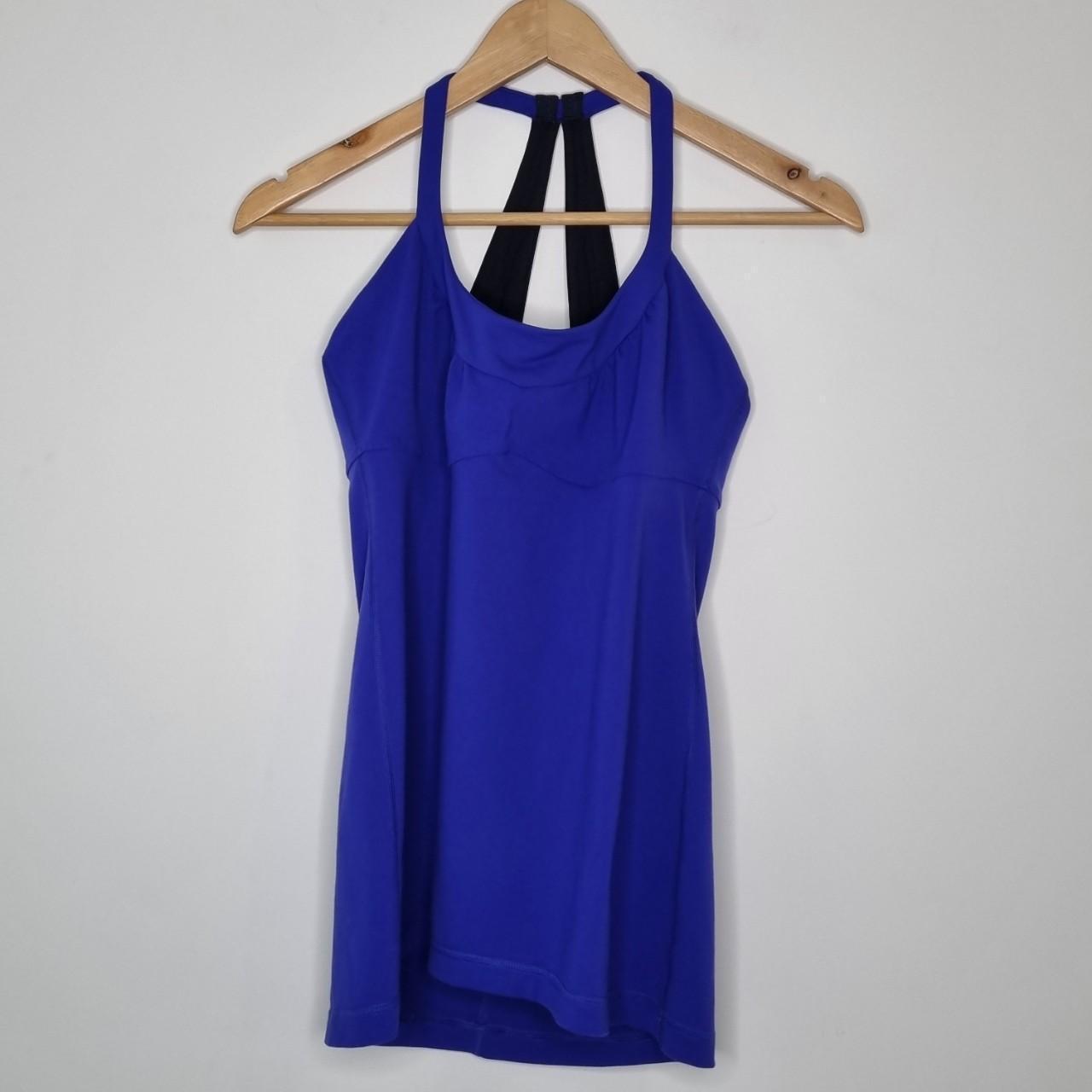 Lululemon Royal Blue Longline Tank Top Strappy Back Size S/M Vibrant Lululemon activewear tank in royal blue with contrasting black strappy racerback detail. Features a supportive built-in shelf bra and flattering longline fit that sits at the hips. Made from Lululemons signature sweat-wicking, four-way stretch fabric perfect for yoga, pilates, gym, or casual wear. - Brand: Lululemon - Size: Tags removed best fits AU 8 (possibly a snug 10). Measures.