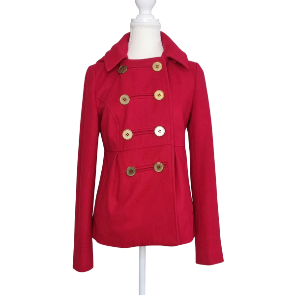 A chic and timeless Miss Shop coat in vibrant red. Designed with a flattering peplum-style fit, double-breasted front with gold-tone buttons, and detachable hood for added versatility. Fully lined for comfort and warmth.