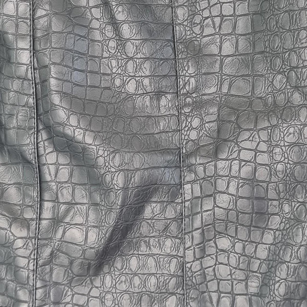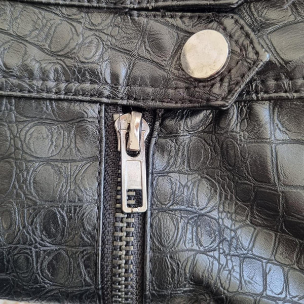 Fierce and stylish faux leather mini skirt with croc-effect texture. Features a full zip-front closure, silver-tone button details, and flap pockets for an edgy finish. Perfect for night outs, concerts, or adding a statement piece to your wardrobe.