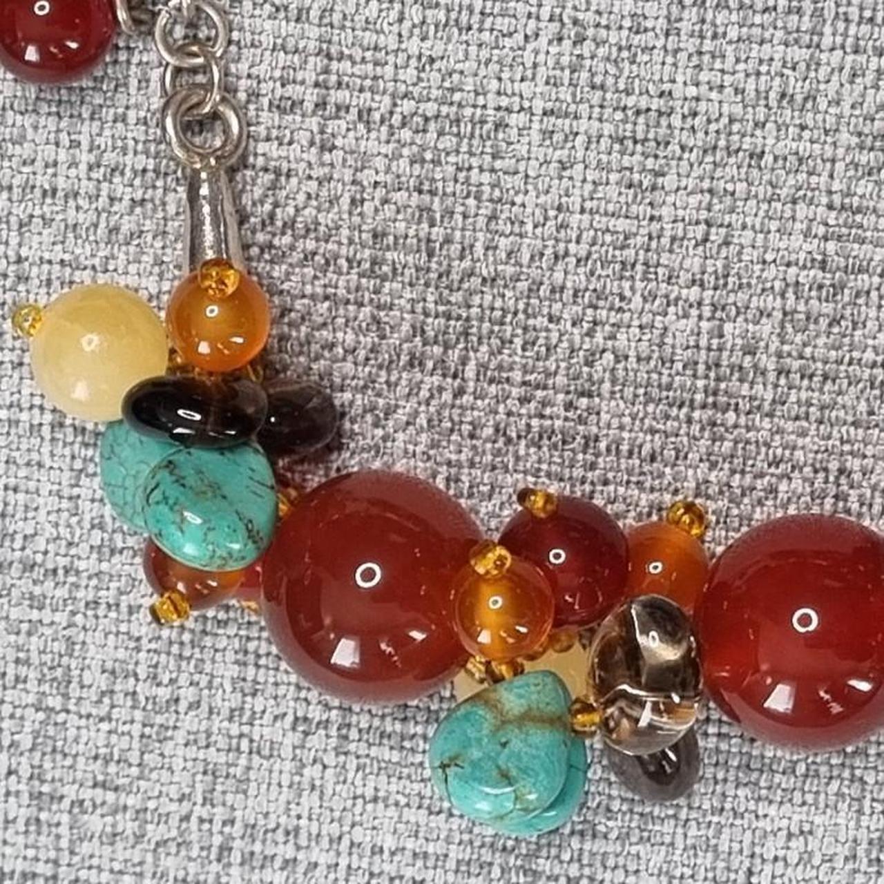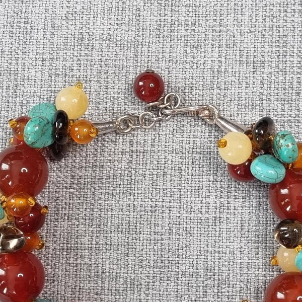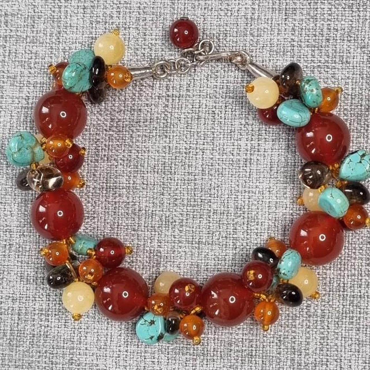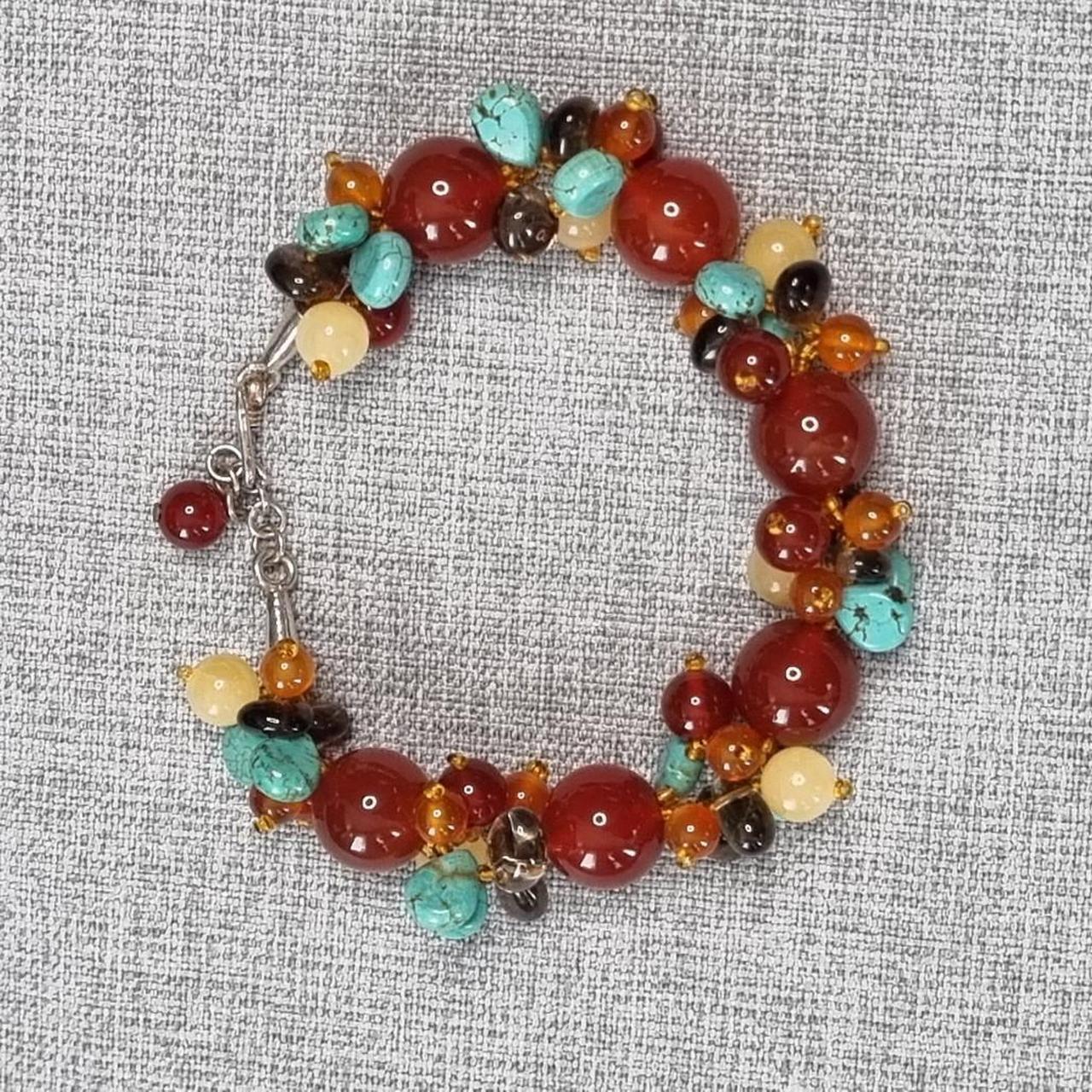 Multi-coloured beaded bracelet with red accents | Glass + natural gemstones | Sterling silver clasp.