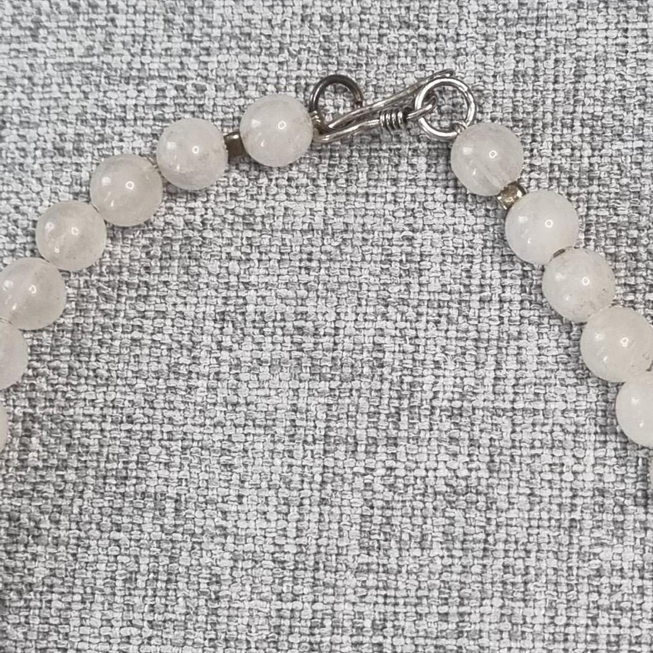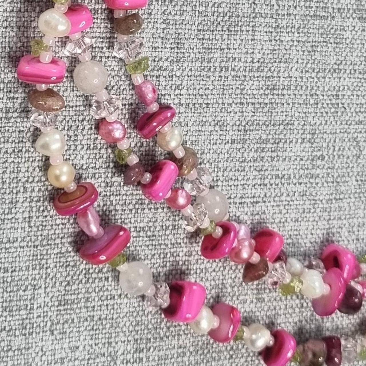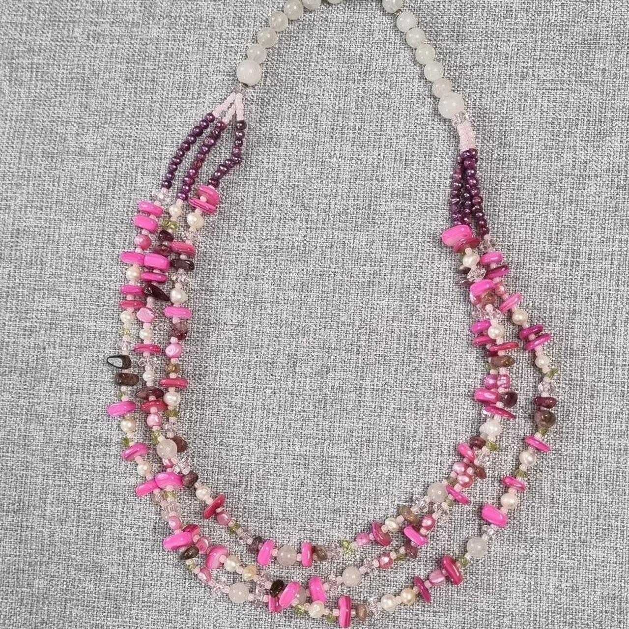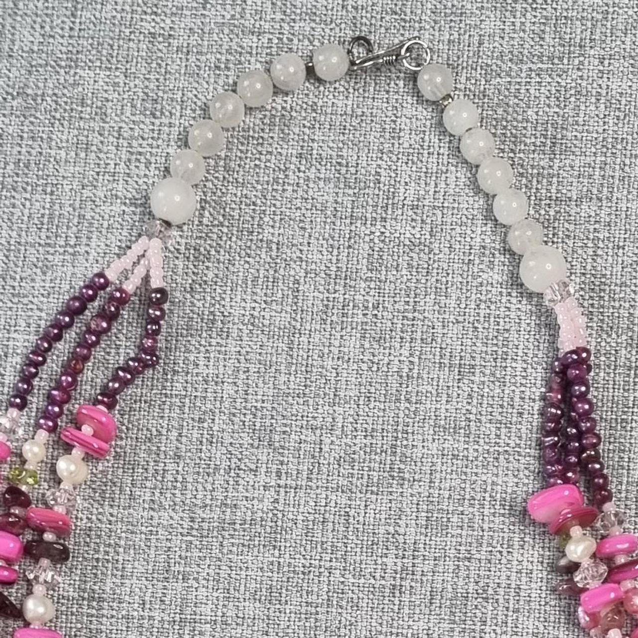 Pink, Purple and white natural gemstone and glass beaded necklace. Sterling Silver clasp. Excellent condition.