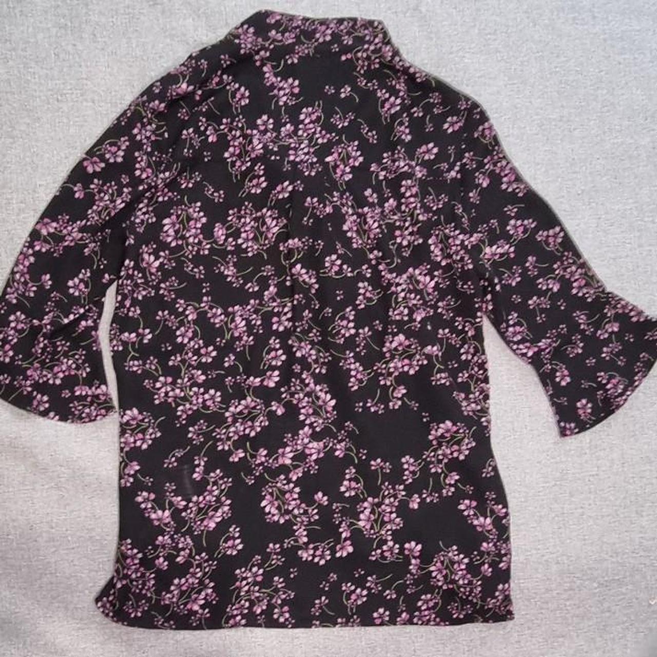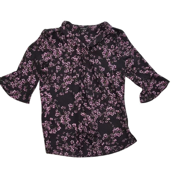 Chic and feminine Portmans black blouse with delicate pink/purple floral print. Designed with flattering bell sleeves and a soft drape for an elegant silhouette.