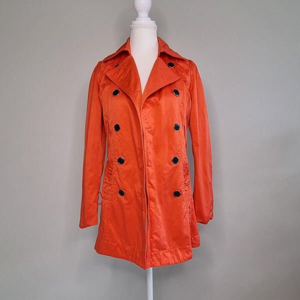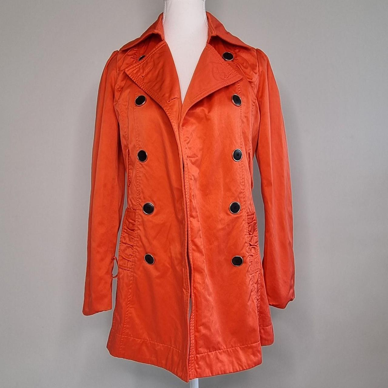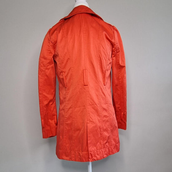 Portmans Vintage Orange Trench Coat Size 6 Bold and vibrant Portmans trench coat in a striking orange-red shade. Double-breasted design with wide lapel collar and black button detailing. Tailored cut for a flattering silhouette. - Brand: Portmans - Size: AU 6 - Colour: Bright orange-red - Style: Double-breasted trench, mid-thigh length - Features: Wide lapels, black buttons, back vent. Fully lined. Condition: Pre-loved. Small hole at end of sleeve (see.