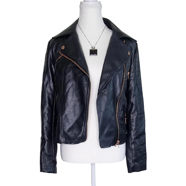 Give your look instant edge with this biker-style faux leather moto jacket. Designed in classic black with rose-gold hardware, it’s the perfect layering piece for day-to-night style. An on-trend wardrobe staple – works with dresses, denim, or casual streetwear.