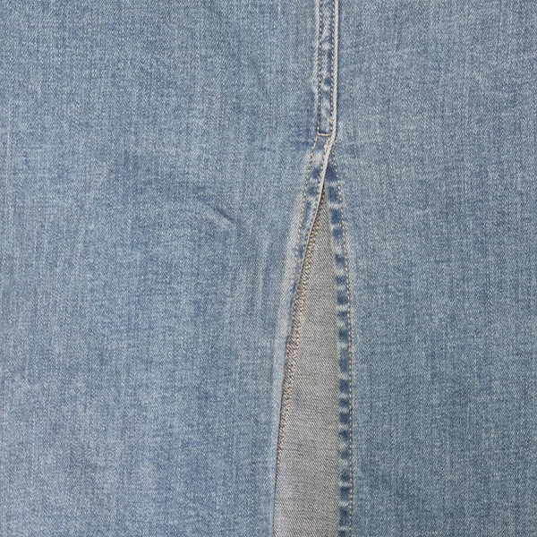 • Style: High-waisted, raw hem, asymmetrical front seam, back vent split